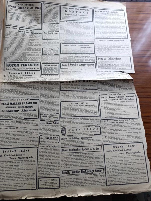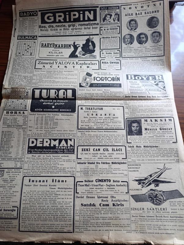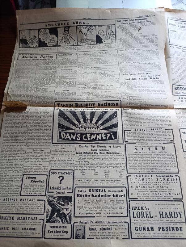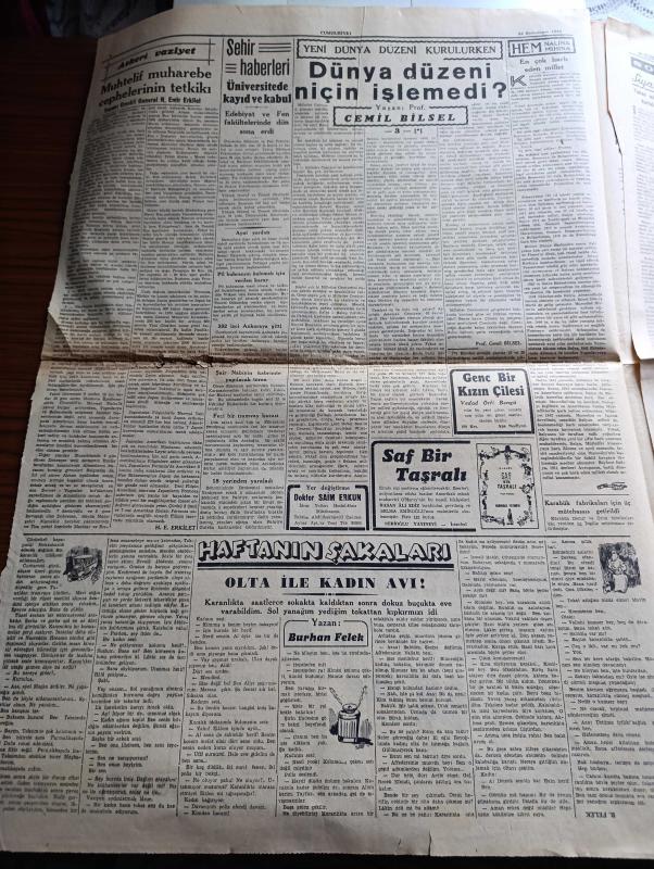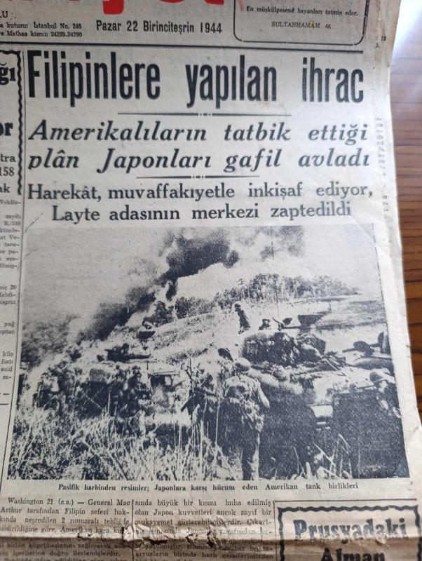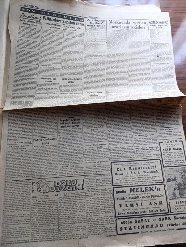 Cumhuriyet Gazetesi - 22 Birinciteşrin (Aralık) 1944 - Moskova tebliği yazan Nadir Nadi Başmakale - Moskova'da verilen kararların akisleri - Pravda Gazetesi Şayanı dikkat bir makale neşretti - filipinler'e yapılan ihraç Amerikalıların taktik ettiği plan Japonları gafil Avladı - zeytinyağı fiyatları ucuzluyor - harp sonrası ve Amerikan ordusu - İngiliz ordusu selanik'e yürüyor fotoğraf - Pasifik harbinden fotoğraflar - müttefiklerin yeni taarruzu - Aachen şehrinde 10.000 esir alındı fotoğraf - haftanın şakaları yazan Burhan Felek - bugün yapılacak maçlar - Fenerbahçe Beşiktaş maçı - Galatasaray Beyoğluspor maçı - Yugoslav kraliyet hükümeti Staline teşekkür ediyor - vahşi aşk filmi Bugün Melek sinemasında - dans cenneti Taksim belediye gazinosunda - Lorel Hardy filmi bugün İpek sinemasında - Mualla Gökçay maksim'de - Zehra bilir Safiye Tokay her akşam novotni Oteli altında aile saz salonunda - İstanbul belediyesi şehir tiyatroları dram kısmında Atinalı Timon komedi meraklı kadınlar adlı eser, Kitap > Süreli Yayınlar > Gazeteler > Türkiye > Genel > Günlük kategorisinde İkinci El olarak satıştadır.