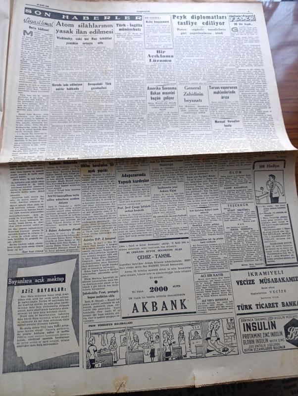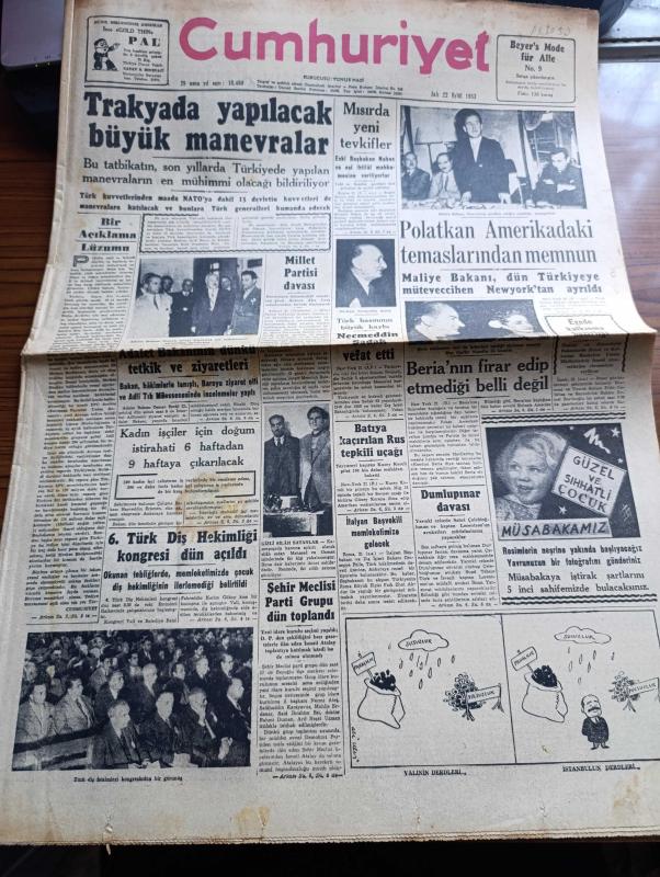 Cumhuriyet Gazetesi - 22 Eylül 1953 - Trakya'da Yapılacak Büyük Manevralar - Adalet Bakanı Osman Şevki Çiçekdağın Dünkü Tetkik Ve Ziyaretleri - Hasan Polatkan Amerika'daki Temaslarında Memnun Fotoğraf - Türk Basınının Büyük Kaybı Necmettin Sadak Vefat Etti - Kasım İşçiler İçin Doğum İstirahati 6 Haftadan 9 Haftaya Çıkarılacak - Beria'nın Rusya'dan Firar Edip Etmediği Belli Değil - Beyaz Köşkte Oturanlar Yazan Rikkat Köknar Yazı Dizisi - Surp Agop Hastanesi'nin Temeli Bugün Atılıyor - Tarihi Şahsiyetlerimizin Kıymetli Portreleri Yazan Haluk Y. Şehsuvaroğlu - 90 Bin Bıçak Yazan Burhan Felek Köşe Yazısı - Atom Silahlarının Yasal İlan Edilmesi - Beyoğluspor Selaniğe Gidiyor - Son Kahkaha Yazan Edison Marshall Yazı Dizisi - 1953 1954 Yunus Nadi Mükafatı En Güzel Hikaye Kısa Bir Yolculuk Yazan Mehmet Ekmekçi - Dünyanın 7 Garibesinden Biri Halikarnas Balıkçısı - Resimli Romanımız Bolo Paşa Vakası Yazan Pierre Gordeaux Yazı Dizisi - Pathe'nin Yeni Zaferi Sesli Sinemaya Makinesi adlı eser, Kitap > Süreli Yayınlar > Gazeteler > Türkiye > Genel > Günlük kategorisinde İkinci El olarak satıştadır.