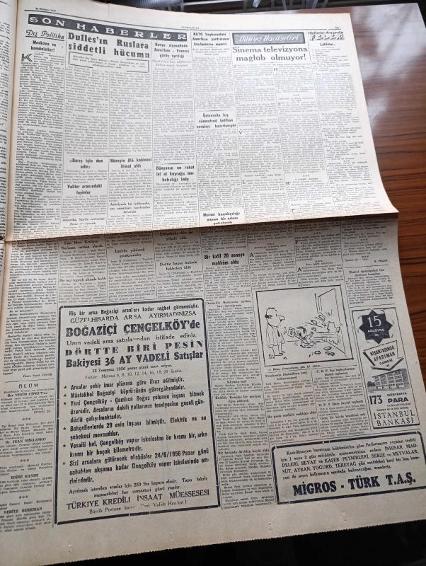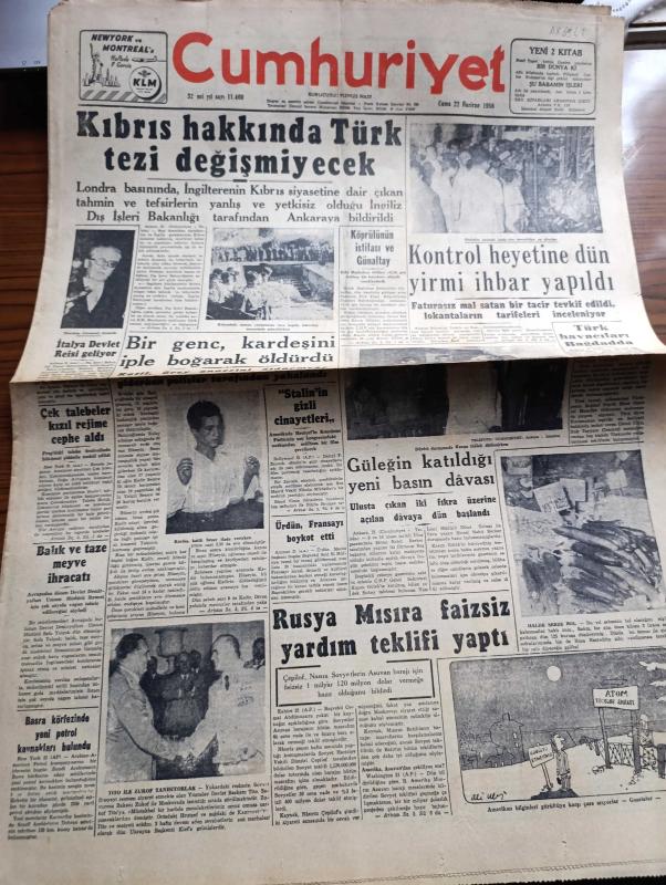 Cumhuriyet Gazetesi - 22 Haziran 1956 - Kıbrıs Hakkında Türk Tezi Değişmeyecek - İtalya Devlet Reisi Giovanni Gronchi - Kasım Gülek'in Katıldığı Yeni Basın Davası - Lokantaların Tarifesi İnceleniyor - Stalin'in Gizli Cinayetleri - Fuat Köprülü'nün İstifası - Çek Talebeler Kızıl Rejime Cephe Aldı - Karanlıkta Sesler Yazan Perihan Zorlu Yazı Dizisi - Mustafa Kemal Derneğinin Kongresi - Sadabad Kasrı - Karacaoğlan Yazan Yaşar Kemal Resimleyen Münif Fehim Yazı Dizisi - Resimli Romanımız Çifte Cinayet Çeviren Mazhar Kunt - Radyo Bugünkü Program - Atom Ve Hidrojen Bombaları Kısırlık Yapıyormuş - Beşiktaş Kulübü Atleti İlhan Bilgitay'ın Rekor Denemesi - Puro Tuvalet Sabunları - İngiliz Atleti Gordon Pirie 5000 Metrede Dünya Rekoru Kırdı - Necipbey Briyantini - Gazetemiz Vasıtasıyla Genç Milli Takımımızı İtalya'ya Davet Ediyor - Milli Basketbol Takımı Antrenörü Samuel Fox - Güngören Mahallesi Arsaları, Yunus Nadi tarafından kaleme alınmıştır. Cumhuriyet Gazetesi - 22 Haziran 1956 - Kıbrıs Hakkında Türk Tezi Değişmeyecek - İtalya Devlet Reisi Giovanni Gronchi - Kasım Gülek'in Katıldığı Yeni Basın Davası - Lokantaların Tarifesi İnceleniyor - Stalin'in Gizli Cinayetleri - Fuat Köprülü'nün İstifası - Çek Talebeler Kızıl Rejime Cephe Aldı - Karanlıkta Sesler Yazan Perihan Zorlu Yazı Dizisi - Mustafa Kemal Derneğinin Kongresi - Sadabad Kasrı - Karacaoğlan Yazan Yaşar Kemal Resimleyen Münif Fehim Yazı Dizisi - Resimli Romanımız Çifte Cinayet Çeviren Mazhar Kunt - Radyo Bugünkü Program - Atom Ve Hidrojen Bombaları Kısırlık Yapıyormuş - Beşiktaş Kulübü Atleti İlhan Bilgitay'ın Rekor Denemesi - Puro Tuvalet Sabunları - İngiliz Atleti Gordon Pirie 5000 Metrede Dünya Rekoru Kırdı - Necipbey Briyantini - Gazetemiz Vasıtasıyla Genç Milli Takımımızı İtalya'ya Davet Ediyor - Milli Basketbol Takımı Antrenörü Samuel Fox - Güngören Mahallesi Arsaları adlı eser Türkçe dilindedir.