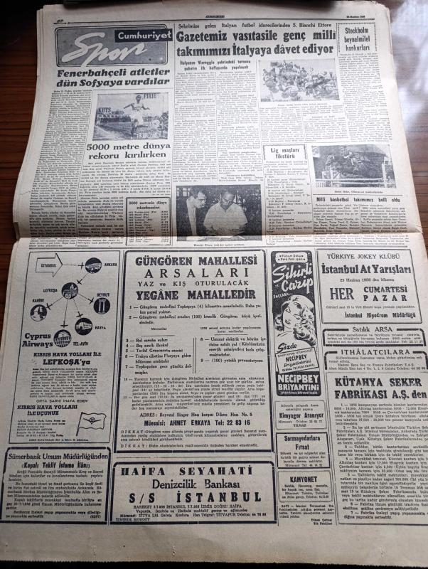 Cumhuriyet Gazetesi - 22 Haziran 1956 - Kıbrıs Hakkında Türk Tezi Değişmeyecek - İtalya Devlet Reisi Giovanni Gronchi - Kasım Gülek'in Katıldığı Yeni Basın Davası - Lokantaların Tarifesi İnceleniyor - Stalin'in Gizli Cinayetleri - Fuat Köprülü'nün İstifası - Çek Talebeler Kızıl Rejime Cephe Aldı - Karanlıkta Sesler Yazan Perihan Zorlu Yazı Dizisi - Mustafa Kemal Derneğinin Kongresi - Sadabad Kasrı - Karacaoğlan Yazan Yaşar Kemal Resimleyen Münif Fehim Yazı Dizisi - Resimli Romanımız Çifte Cinayet Çeviren Mazhar Kunt - Radyo Bugünkü Program - Atom Ve Hidrojen Bombaları Kısırlık Yapıyormuş - Beşiktaş Kulübü Atleti İlhan Bilgitay'ın Rekor Denemesi - Puro Tuvalet Sabunları - İngiliz Atleti Gordon Pirie 5000 Metrede Dünya Rekoru Kırdı - Necipbey Briyantini - Gazetemiz Vasıtasıyla Genç Milli Takımımızı İtalya'ya Davet Ediyor - Milli Basketbol Takımı Antrenörü Samuel Fox - Güngören Mahallesi Arsaları adlı eser, Kitap > Süreli Yayınlar > Gazeteler > Türkiye > Genel > Günlük kategorisinde İkinci El olarak satıştadır.