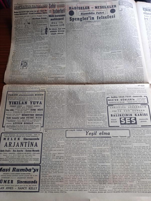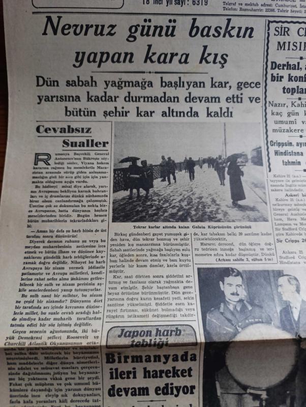 Cumhuriyet Gazetesi - 22 Mart 1942 - Cevapsız Sualler Cumhuriyet Başmakale - Nevruz günü baskı yapan kara kış - karlar altında kalan Galata köprüsü'nün görünüşü - Japon harp tebliği birmanya'da ileri hareket devam ediyor - Amerika'nın muhtelif cephelere sevk ettiği son sistem ağır tanklardan fotoğraf - bomba muhakemesi 1 Nisan'da Ankara ağırceza mahkemesinde başlayacak - Anıtkabir jüri azaları dönüyor - Mısır başvekili Nahas Paşaya bir talebe kurşun attı başvekile bir şey olmadı - şark cephesinden resimler - Taksim sinemasında bugün yıkılan yuva başrolde Fatma Rüştü - arjantina filmi Melek sinemasında - Spengler'in felsefesi yazan Ziyaeddin Fahri - Milli korunma mahkemesi Dün ilk kararını verdi - sızı yazan Mükerrem Kamil Su Yazı Dizisi - bugün Edirne'de yapılacak kır koşusu - Erna Sack'ın Bugünkü Konseri - Şen Şapka Sultanhamamda - bugünkü radyo programı - izona saç sabunu - borsa, Yunus Nadi tarafından kaleme alınmıştır. Cumhuriyet Gazetesi - 22 Mart 1942 - Cevapsız Sualler Cumhuriyet Başmakale - Nevruz günü baskı yapan kara kış - karlar altında kalan Galata köprüsü'nün görünüşü - Japon harp tebliği birmanya'da ileri hareket devam ediyor - Amerika'nın muhtelif cephelere sevk ettiği son sistem ağır tanklardan fotoğraf - bomba muhakemesi 1 Nisan'da Ankara ağırceza mahkemesinde başlayacak - Anıtkabir jüri azaları dönüyor - Mısır başvekili Nahas Paşaya bir talebe kurşun attı başvekile bir şey olmadı - şark cephesinden resimler - Taksim sinemasında bugün yıkılan yuva başrolde Fatma Rüştü - arjantina filmi Melek sinemasında - Spengler'in felsefesi yazan Ziyaeddin Fahri - Milli korunma mahkemesi Dün ilk kararını verdi - sızı yazan Mükerrem Kamil Su Yazı Dizisi - bugün Edirne'de yapılacak kır koşusu - Erna Sack'ın Bugünkü Konseri - Şen Şapka Sultanhamamda - bugünkü radyo programı - izona saç sabunu - borsa adlı eser Türkçe dilindedir.