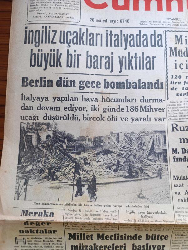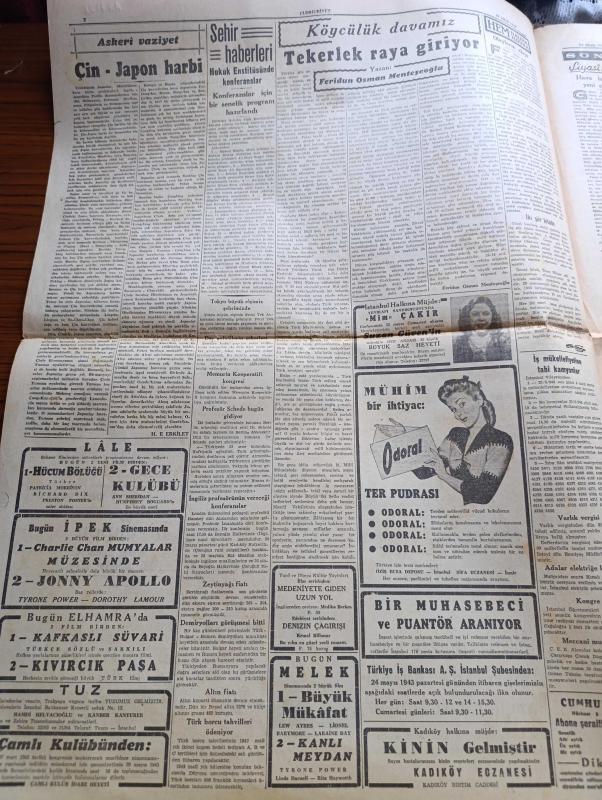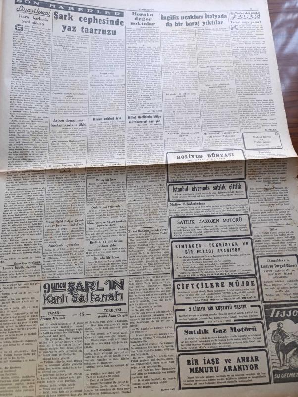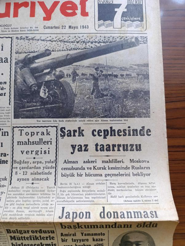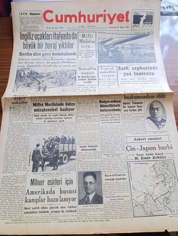 Cumhuriyet Gazetesi - 22 Mayıs 1943 - Meraka Değer Noktalar Yazan Nadir Nadi Köşe Yazısı - İngiliz Uçakları İtalya'da Da Büyük Bir Baraj Yıktılar - Millî Müdafaa İçin 120 Milyon Lira Fevkalade Tahsisat Verilecek - Şark Cephesinde Yaz Taarruzu - Japon Donanması Başkumandanı Amiral Yamamoto Öldü - İbrahim Sünuhi Arsan - Askeri Vaziyet Çin Japon Harbi Yazan Emekli General H. Emir Erkilet Yazı Dizisi - Başvekil Şükrü Saracoğlu Tarafından Verilecek Ziyafet - Roosevelt'in Mesajı M. Davies Tarafından Staline Verildi - Suzan Güven'in İştirakiyle Büyük Saz Heyeti Yenikapı Sandıkburnunda - Profesör Schede Bugün Gidiyor - Tekerlek Raya Giriyor Yazan Feridun Osman Menteşoğlu - 9. Şarl'ın Kanlı Saltanatı Yazan Prosper Merimee Yazı Dizisi - Tissot Saat - Charlie Chan Mumyalar Müzesinde Bugün İpek Sinemasında - Blaupunkt 8 Lambalı Radyoları Gelmiştir - Bugünkü Radyo Programı - Borsa - Petrol Nizam Saç Bakımı Güzelliğin Birinci Şartıdır - Açık Arttırma İle Satış - Kavaklıdere Şarapları adlı eser, Kitap > Süreli Yayınlar > Gazeteler > Türkiye > Genel > Günlük kategorisinde İkinci El olarak satıştadır.
