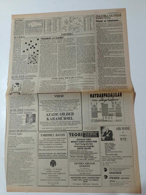 Cumhuriyet Gazetesi - 22 Mayıs 1991 - Rıdvan Dilmen Ve Tanju Çolak Yara Açtı - Statlara Turnike İstiyoruz - Alp Yalman - Şevket Belgin - Mehmet Özbek - Beşiktaş Taraftarda Da Şampiyon - TSYD Turnuvası adlı eser Türkçe dilindedir.