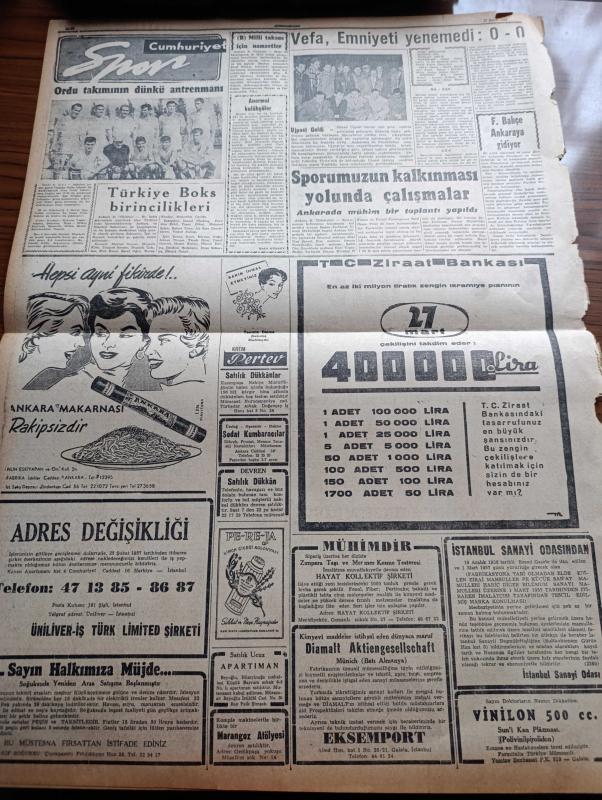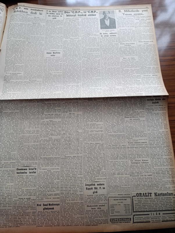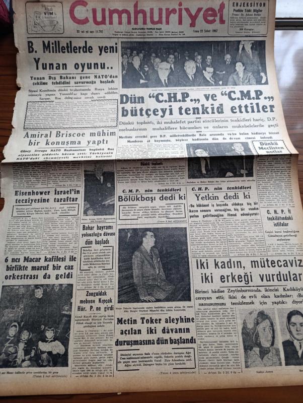 Cumhuriyet Gazetesi - 22 Şubat 1957 - Birleşmiş Milletlerde Yeni Yunan Oyunu - Güney Avrupa NATO Başkomutanı Amiral Briscoe Mühim Bir Konuşma Yaptı - Eisenhower İsrail'in Tecziyesine Taraftar - Bahar Bayramı Yolsuzluğu Davası Dün Başladı - Dün CHP'yi Ve Cumhuriyetçi Millet Partisi Bütçeyi Tenkid Ettiler - Osman Bölükbaşı Dedi Ki - Metin Toker Aleyhine Duruşmasına Dün Başlandı - Demokrat Parti'den İhraç Edilen Zonguldak Mebusu Cemal Kıpçak Hürriyet Partisine Girdi - İdam Sehpasında Can Veren Devletliler Derleyen Cemaleddin Saraçoğlu Yazı Dizisi - Despot Yazan Reşat Enis Yazı Dizisi - Aydınlar Arasında Bir Anket - Kuzey Afrika'da Fransa Yazan Numan Menemencioğlu - Hamdi Varoğlu Köşe Yazısı - Osmanlı Bankası - Milliyetçi Çin Delegesi Kıbrıs'ın Türklüğünü Belirtiyor - Vefa Emniyeti Yenemedi 0 0 - Türkiye Boks Birincilikleri - Ordu Takımının Dünkü Antrenmanı - Fenerbahçe Ankara'ya Gidiyor - Macar Ujpest Takımı Geldi - Sporumuzun Kalkınması Yolunda Çalışmalar - Nuh'un Ankara makarnası adlı eser, Kitap > Süreli Yayınlar > Gazeteler > Türkiye > Genel > Günlük kategorisinde İkinci El olarak satıştadır.