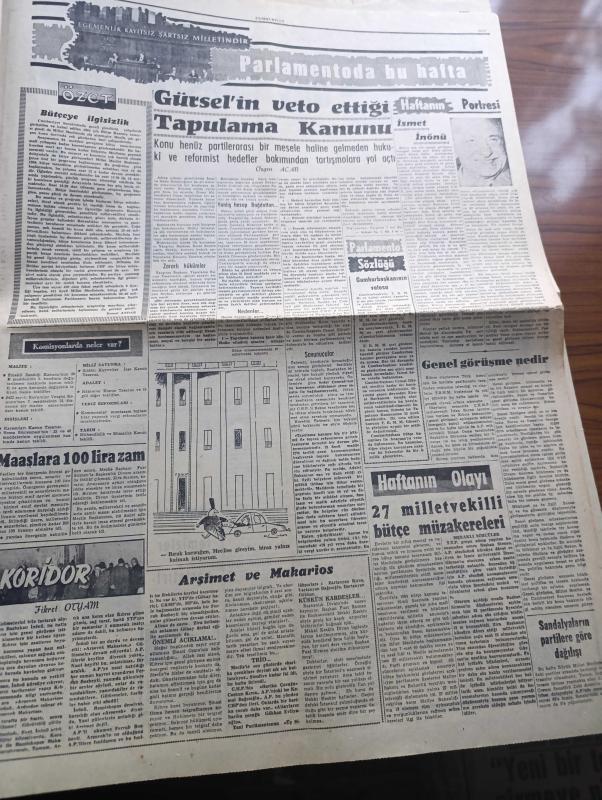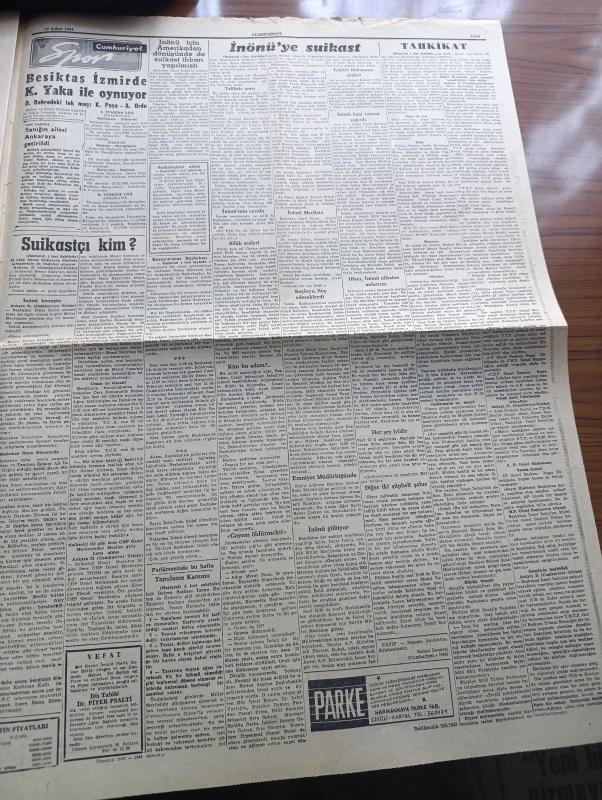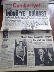 Cumhuriyet Gazetesi - 22 Şubat 1964 - İsmet İnönü'ye Suikast - Suikastçi Başbakan İsmet İnönü'ye Dört Metre Mesafeden Tabanca İle Üç El Ateş Etti İsabet Kaydedemedi - Suikastçi Mesut Suna Kayseri'de Çalışan Bit Elektrik İşçisi - Olay Anında İsmet İnönü'nün Yanındaki Tek Gazeteci Cumhuriyet Muhabiri Haluk Besen Anlatıyor - Suikast Yazan Ecvet Güresin - Suikastçının Eşi İle Çocukları Dün Nezaret Altına Alındı - İlhan Selçuk Köşe Yazısı - Bay Oscar Karikatür - Herkesin Cenneti Yazan Rikkat Köknar Yazı Dizisi - Haftanın Olaylarında Toplu Bakış Yazan Hilmi Yavuz - Öldüren Sir Çizgi Roman - 40 Yıl Önce Meclis Kuranı Kerim'in Tercümesini Kabul Etti - Zencilerin Çilesi Yazan Vecdi Kızıldemir Yazı Dizisi - Beşiktaş'ın İzmir'de Karşıyaka İle Oynuyor - İsmet İnönü'ye Suikast Teşebbüsü Olayı İle İlgili Diğer Resimler adlı eser, Kitap > Süreli Yayınlar > Gazeteler > Türkiye > Genel > Günlük kategorisinde İkinci El olarak satıştadır.