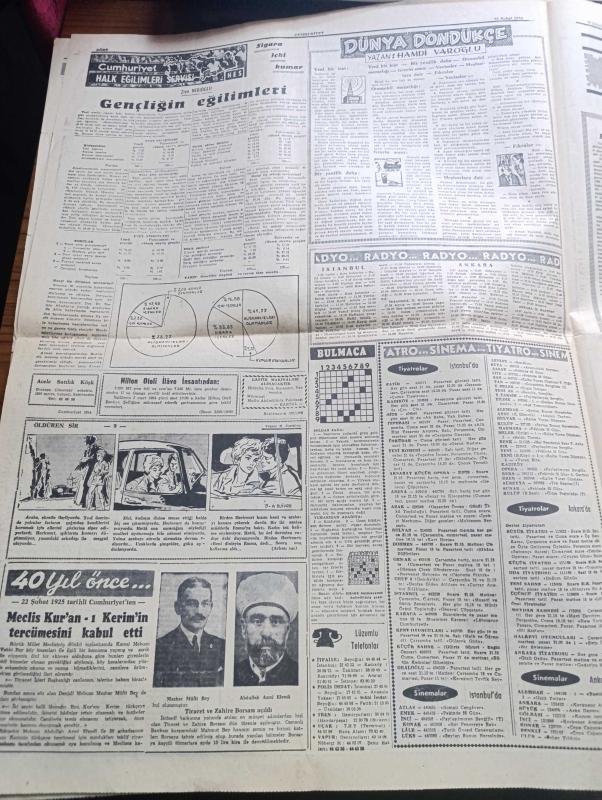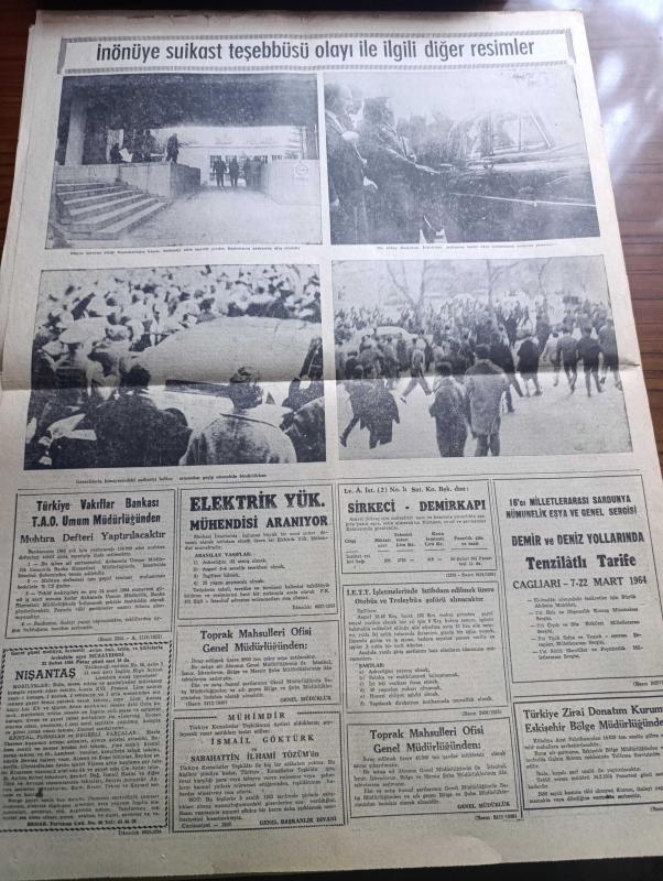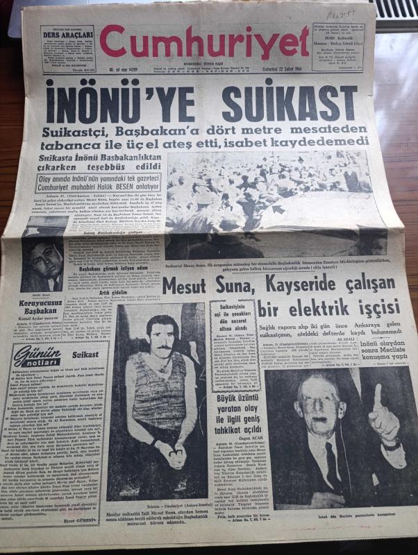 Cumhuriyet Gazetesi - 22 Şubat 1964 - İsmet İnönü'ye Suikast - Suikastçi Başbakan İsmet İnönü'ye Dört Metre Mesafeden Tabanca İle Üç El Ateş Etti İsabet Kaydedemedi - Suikastçi Mesut Suna Kayseri'de Çalışan Bit Elektrik İşçisi - Olay Anında İsmet İnönü'nün Yanındaki Tek Gazeteci Cumhuriyet Muhabiri Haluk Besen Anlatıyor - Suikast Yazan Ecvet Güresin - Suikastçının Eşi İle Çocukları Dün Nezaret Altına Alındı - İlhan Selçuk Köşe Yazısı - Bay Oscar Karikatür - Herkesin Cenneti Yazan Rikkat Köknar Yazı Dizisi - Haftanın Olaylarında Toplu Bakış Yazan Hilmi Yavuz - Öldüren Sir Çizgi Roman - 40 Yıl Önce Meclis Kuranı Kerim'in Tercümesini Kabul Etti - Zencilerin Çilesi Yazan Vecdi Kızıldemir Yazı Dizisi - Beşiktaş'ın İzmir'de Karşıyaka İle Oynuyor - İsmet İnönü'ye Suikast Teşebbüsü Olayı İle İlgili Diğer Resimler, Yunus Nadi tarafından kaleme alınmıştır. Cumhuriyet Gazetesi - 22 Şubat 1964 - İsmet İnönü'ye Suikast - Suikastçi Başbakan İsmet İnönü'ye Dört Metre Mesafeden Tabanca İle Üç El Ateş Etti İsabet Kaydedemedi - Suikastçi Mesut Suna Kayseri'de Çalışan Bit Elektrik İşçisi - Olay Anında İsmet İnönü'nün Yanındaki Tek Gazeteci Cumhuriyet Muhabiri Haluk Besen Anlatıyor - Suikast Yazan Ecvet Güresin - Suikastçının Eşi İle Çocukları Dün Nezaret Altına Alındı - İlhan Selçuk Köşe Yazısı - Bay Oscar Karikatür - Herkesin Cenneti Yazan Rikkat Köknar Yazı Dizisi - Haftanın Olaylarında Toplu Bakış Yazan Hilmi Yavuz - Öldüren Sir Çizgi Roman - 40 Yıl Önce Meclis Kuranı Kerim'in Tercümesini Kabul Etti - Zencilerin Çilesi Yazan Vecdi Kızıldemir Yazı Dizisi - Beşiktaş'ın İzmir'de Karşıyaka İle Oynuyor - İsmet İnönü'ye Suikast Teşebbüsü Olayı İle İlgili Diğer Resimler adlı eser Türkçe dilindedir.