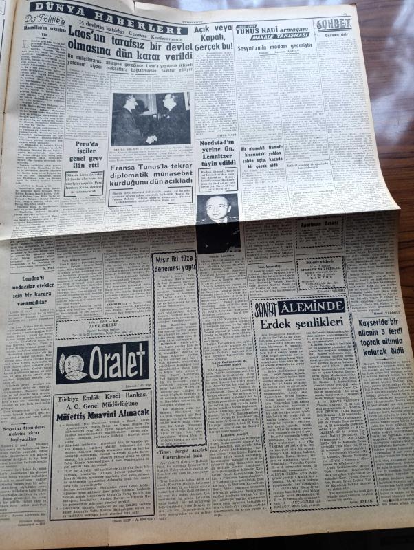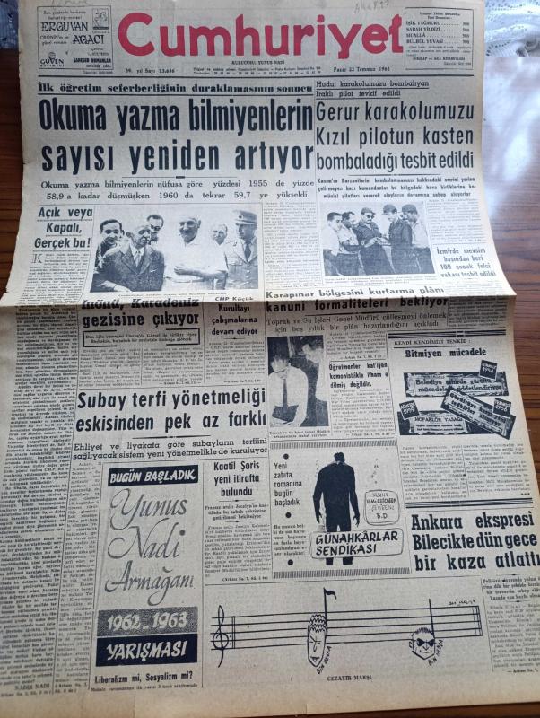 Cumhuriyet Gazetesi - 22 Temmuz 1962 - Nadir Nadi Köşe Yazısı - Okuma Yazma Bilmeyenlerin Sayısı Yeniden Artıyor - Gerur Karakolumuzu Kızıl Pilotun Kasten Bombaladığı Tesbit Edildi - İsmet İnönü Karadeniz Gezisine Çıkıyor - Karapınar Bölgesini Çölleşmeden Kurtarma Planı Kanuni Formaliteleri Bekliyor - Kalkınma Ne Demek Yazan İlhan Selçuk Köşe Yazısı - Gecenin Ucundaki Işık Yazan Peride Celal Yazı Dizisi - Milli Türk Talebe Birliği İdarecileri İtham ediliyor - Laos'un Tarafsız Bir Devlet Olmasına Dün Karar Verildi - 1962 1963 Yunus Nadi Armağanı Makale Yarışması Sosyalizminin Modası Geçmiştir Yazan Samim Anday - Haftanın Şakaları Yazan Burhan Felek Köşe Yazısı - Bay Oscar Karikatür - Jane'in Kızı Çizgi Roman - Resimli Roman Melun Kız Çizen Yves Sayol Yazı Dizisi - General Motors'un Yıllık Hasılat Tutarı Türkiye Milli Bütçesinin 11 Misli - Milletlerarası Bir Öğrenci Köyü Kuruluyor - Başkan Cemal Gürsel Sporculara Çalışma Tavsiye Etti - Avrupa Yelken Şampiyonası Östend'te Başladı, Yunus Nadi tarafından kaleme alınmıştır. Cumhuriyet Gazetesi - 22 Temmuz 1962 - Nadir Nadi Köşe Yazısı - Okuma Yazma Bilmeyenlerin Sayısı Yeniden Artıyor - Gerur Karakolumuzu Kızıl Pilotun Kasten Bombaladığı Tesbit Edildi - İsmet İnönü Karadeniz Gezisine Çıkıyor - Karapınar Bölgesini Çölleşmeden Kurtarma Planı Kanuni Formaliteleri Bekliyor - Kalkınma Ne Demek Yazan İlhan Selçuk Köşe Yazısı - Gecenin Ucundaki Işık Yazan Peride Celal Yazı Dizisi - Milli Türk Talebe Birliği İdarecileri İtham ediliyor - Laos'un Tarafsız Bir Devlet Olmasına Dün Karar Verildi - 1962 1963 Yunus Nadi Armağanı Makale Yarışması Sosyalizminin Modası Geçmiştir Yazan Samim Anday - Haftanın Şakaları Yazan Burhan Felek Köşe Yazısı - Bay Oscar Karikatür - Jane'in Kızı Çizgi Roman - Resimli Roman Melun Kız Çizen Yves Sayol Yazı Dizisi - General Motors'un Yıllık Hasılat Tutarı Türkiye Milli Bütçesinin 11 Misli - Milletlerarası Bir Öğrenci Köyü Kuruluyor - Başkan Cemal Gürsel Sporculara Çalışma Tavsiye Etti - Avrupa Yelken Şampiyonası Östend'te Başladı adlı eser Türkçe dilindedir.