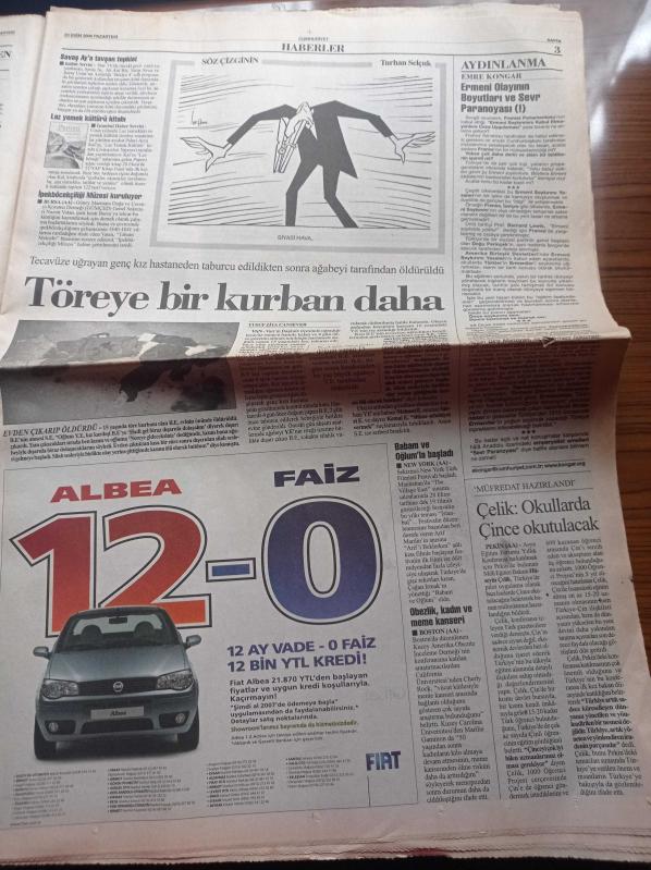 Cumhuriyet Gazetesi - 23 Ekim 2006 - Ermeni Olayının Boyutları Ve Sevr Paranoyası - Emre Kongar - Milli Eğitim Bakanı Hüseyin Çelik Okullarda Çince Öğretilecek - Bomonti Bira Fabrikası Kültür Merkezi Olsun - Arthur Zico Revizyon Yaptı - İspanyol Pilotu Fernando Alonso Şampiyon - Duble Yol Çekirdek Tarlası - Ali Babacan - Yeşil Sermaye Rafta - Aranan Adam Yimpaş Holding Yönetim Kurulu Başkanı Dursun Uyar Cenazede - Bekaret Tartışması - Cumhurbaşkanı Ahmet Necdet Sezer adlı eser, Kitap > Süreli Yayınlar > Gazeteler kategorisinde İkinci El olarak satıştadır.