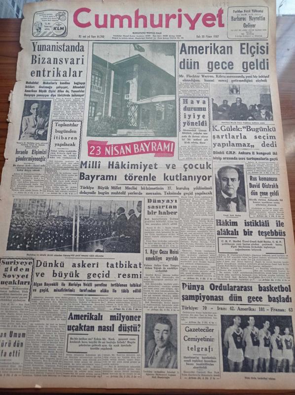 Cumhuriyet Gazetesi - 23 Nisan 1957 - Dünkü Askeri Tatbikat Ve Büyük Geçid Resmi -Amerikan Elçisi Mr. Flechter Warren Dün Gece Geldi - Yunanistanda Bizansvari Entrikalar - Kasım Gülek Bugünkü Şartlarla Seçim Yapılamaz Dedi - 23 Nisan Bayramı - Milli Hakimiyet Ve Çocuk Bayramı Törenle Kutlanıyor - İsraile Elçimizi Göndermeyeceğiz - Suriye'ye Giden Sovyet Uçakları - 1. Ağır Ceza Reisi Nefi Demircioğlu Emekliye Ayrıldı - Dünya Ordulararası Basketbol Şampiyonası Dün Gece Başladı - 50 Yıl Evvelki Kuleliden Hatıralar Yazı Dizisi - Sıddık Sami Onar - Burhan Felek - Türkiye Vakıflar Bankası - Resimli Romanımız Mormon Mezhebi Ve Kurucusunun Dramı - Kula Mensucat Fabrikası - Spor Ve Sergi Sarayı Olarak Yaptırılan Bina - Devrin Maruf Penaltıcıları Topuz Hikmet Refik Osman Ve Bekir - Uhu Herşeyin Mürekkebi adlı eser, Kitap > Süreli Yayınlar > Gazeteler > Türkiye > Genel > Günlük kategorisinde İkinci El olarak satıştadır.