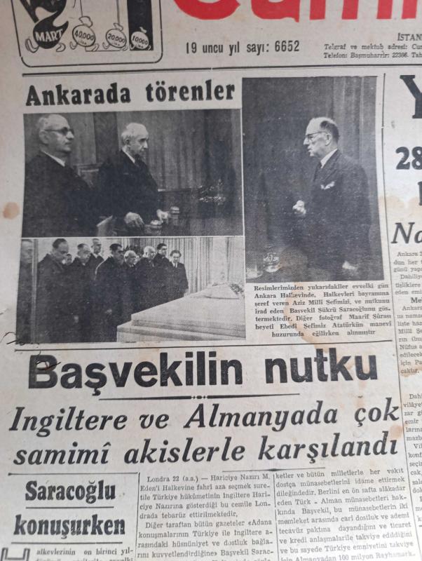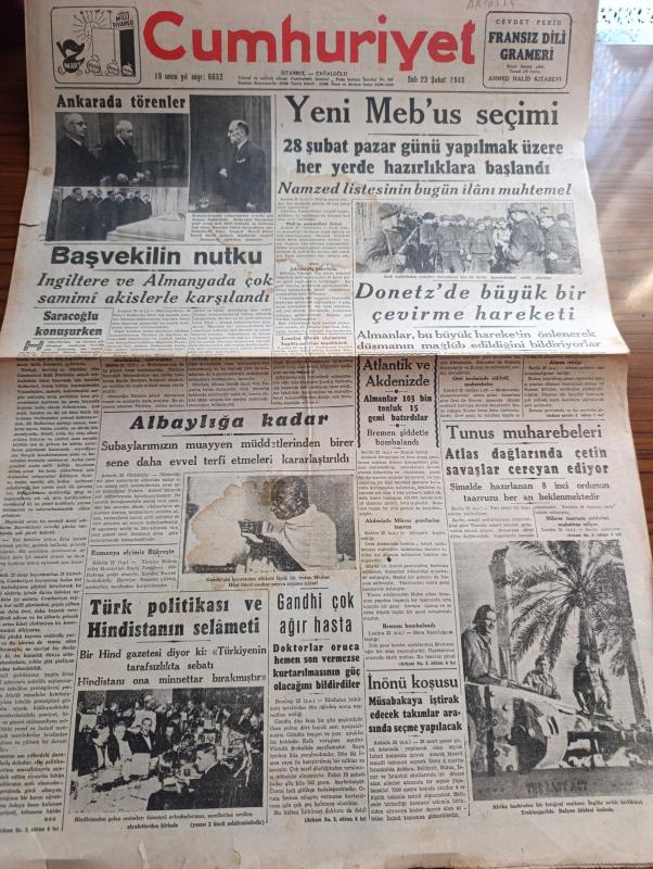 Cumhuriyet Gazetesi - 23 Şubat 1943 - Saraçoğlu konuşurken Cumhuriyet Başmakale - Başvekil Şükrü Saraçoğlu'nun Nutku İngiltere ve Almanya'da çok samimi akislerle karşılandı - Halkevleri bayramına Şeref veren Aziz milli şefimiz İsmet İnönü fotoğraf - yeni mebus seçimi - namzet listesinin bugün ilanı muhtemel - Donetz'de büyük bir çevirme hareketi - şark cephesinde sovyetlerin küçük birlik kumandanları vazife alıyorlar fotoğraf - Atlantik ve Akdeniz'de Almanlar 103 bin tonluk 15 gemi batırdılar - Gandhi çok ağır hasta - Tunus muharebeleri Atlas dağları'nda çetin savaşlar devam ediyor - İnönü koşusu - Afrika harbinden bir fotoğraf - Türk politikası ve Hindistan'ın selameti - Anglosaksonlar dünyasında yazan Abidin Daver yazı dizisi - Goebbels'in nutkundan bazı noktalar Yazan Emekli General H. Emir Erkilet - Varlık vergisi vermeyen Vagnat Estepan Manol Kazakof Hireci Mehteryan Nikola Zolidis Oskıyan Günaltın demir kapı toplanma kampına sevk edilenlerden bazıları - yeni ekmek kartları, Yunus Nadi tarafından kaleme alınmıştır. Cumhuriyet Gazetesi - 23 Şubat 1943 - Saraçoğlu konuşurken Cumhuriyet Başmakale - Başvekil Şükrü Saraçoğlu'nun Nutku İngiltere ve Almanya'da çok samimi akislerle karşılandı - Halkevleri bayramına Şeref veren Aziz milli şefimiz İsmet İnönü fotoğraf - yeni mebus seçimi - namzet listesinin bugün ilanı muhtemel - Donetz'de büyük bir çevirme hareketi - şark cephesinde sovyetlerin küçük birlik kumandanları vazife alıyorlar fotoğraf - Atlantik ve Akdeniz'de Almanlar 103 bin tonluk 15 gemi batırdılar - Gandhi çok ağır hasta - Tunus muharebeleri Atlas dağları'nda çetin savaşlar devam ediyor - İnönü koşusu - Afrika harbinden bir fotoğraf - Türk politikası ve Hindistan'ın selameti - Anglosaksonlar dünyasında yazan Abidin Daver yazı dizisi - Goebbels'in nutkundan bazı noktalar Yazan Emekli General H. Emir Erkilet - Varlık vergisi vermeyen Vagnat Estepan Manol Kazakof Hireci Mehteryan Nikola Zolidis Oskıyan Günaltın demir kapı toplanma kampına sevk edilenlerden bazıları - yeni ekmek kartları adlı eser Türkçe dilindedir.