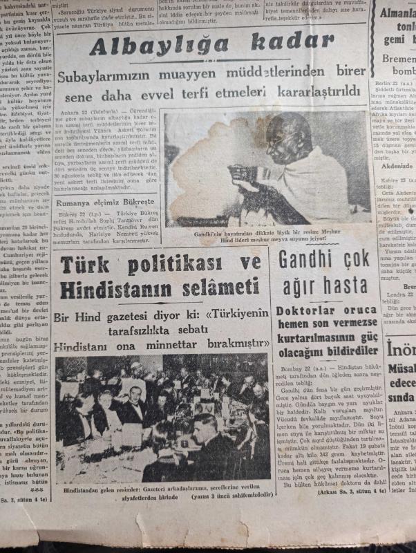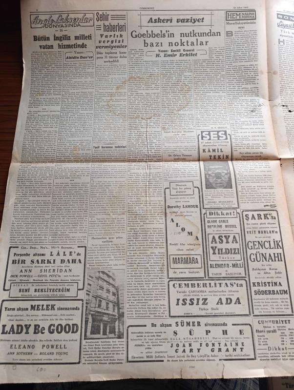 Cumhuriyet Gazetesi - 23 Şubat 1943 - Saraçoğlu konuşurken Cumhuriyet Başmakale - Başvekil Şükrü Saraçoğlu'nun Nutku İngiltere ve Almanya'da çok samimi akislerle karşılandı - Halkevleri bayramına Şeref veren Aziz milli şefimiz İsmet İnönü fotoğraf - yeni mebus seçimi - namzet listesinin bugün ilanı muhtemel - Donetz'de büyük bir çevirme hareketi - şark cephesinde sovyetlerin küçük birlik kumandanları vazife alıyorlar fotoğraf - Atlantik ve Akdeniz'de Almanlar 103 bin tonluk 15 gemi batırdılar - Gandhi çok ağır hasta - Tunus muharebeleri Atlas dağları'nda çetin savaşlar devam ediyor - İnönü koşusu - Afrika harbinden bir fotoğraf - Türk politikası ve Hindistan'ın selameti - Anglosaksonlar dünyasında yazan Abidin Daver yazı dizisi - Goebbels'in nutkundan bazı noktalar Yazan Emekli General H. Emir Erkilet - Varlık vergisi vermeyen Vagnat Estepan Manol Kazakof Hireci Mehteryan Nikola Zolidis Oskıyan Günaltın demir kapı toplanma kampına sevk edilenlerden bazıları - yeni ekmek kartları adlı eser, Kitap > Süreli Yayınlar > Gazeteler > Türkiye > Genel > Günlük kategorisinde İkinci El olarak satıştadır.