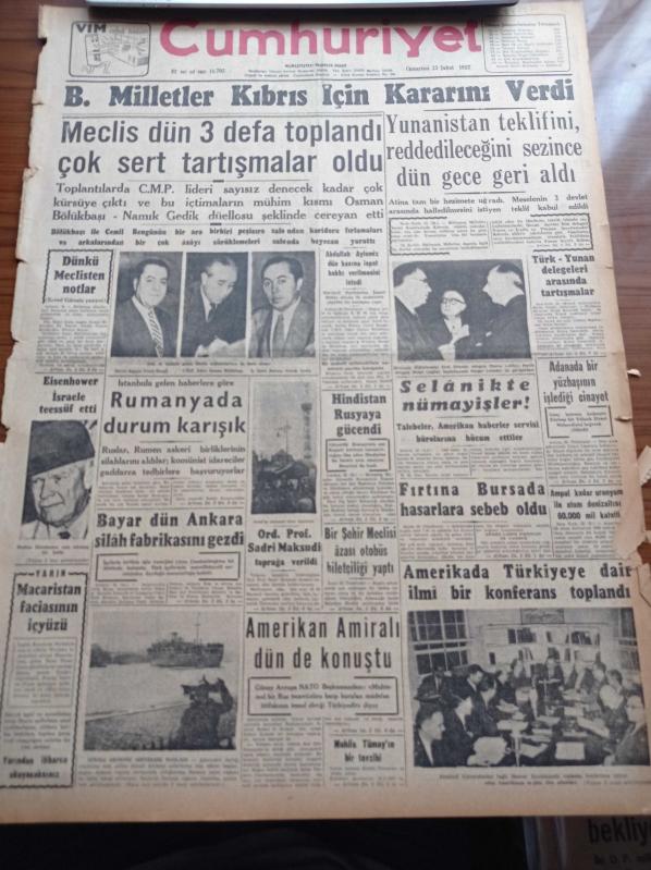 Cumhuriyet Gazetesi - 23 Şubat 1957 - Birleşmiş Milletler Kıbrıs İçin Kararını Verdi - Mecliste Osman Bölükbaşı Namık Gedik Düellosu - Amerikan Başkanı Eisenhower İsrail'e Teessüf Etti - Reisicumhur Celal Bayar Dün Ankara Silah Fabrikasını Gezdi - Ordinaryüs Profesör Sadri Maksudi Toprağa Verildi - Türk Yunan Delegeleri Arasında Tartışmalar - Amerika'da Türkiye'ye Dair İlmi Bir Konferans Toplandı - İdam Sehpasında Can Veren Devletliler Yazı Dizisi - Konservatuar Tiyatro Bölümü Elektra'yı Temsil Edecek - Burhan Felek - İngiliz Kraliçesi Elizabeth Kocasını Prens Yaptı - Resimli Romanımız Mormon Mezhebi Ve Kurucusunun Dramı - İç Çamaşırı Koklamaya Meraklı Hırsız Necati Macid - Spor Ve Sergi Sarayında Dünya Şampiyonlarından Adil Atan'ın Gecesi - Dansöz Ayşe Nana- Dünya Ordulararası Futbol Şampiyonası - İtalyan Ordu Takımı Dün Akşam İzmir'e Geldi - İstanbulspor Adalet Karşılaşıyor, Yunus Nadi tarafından kaleme alınmıştır. Cumhuriyet Gazetesi - 23 Şubat 1957 - Birleşmiş Milletler Kıbrıs İçin Kararını Verdi - Mecliste Osman Bölükbaşı Namık Gedik Düellosu - Amerikan Başkanı Eisenhower İsrail'e Teessüf Etti - Reisicumhur Celal Bayar Dün Ankara Silah Fabrikasını Gezdi - Ordinaryüs Profesör Sadri Maksudi Toprağa Verildi - Türk Yunan Delegeleri Arasında Tartışmalar - Amerika'da Türkiye'ye Dair İlmi Bir Konferans Toplandı - İdam Sehpasında Can Veren Devletliler Yazı Dizisi - Konservatuar Tiyatro Bölümü Elektra'yı Temsil Edecek - Burhan Felek - İngiliz Kraliçesi Elizabeth Kocasını Prens Yaptı - Resimli Romanımız Mormon Mezhebi Ve Kurucusunun Dramı - İç Çamaşırı Koklamaya Meraklı Hırsız Necati Macid - Spor Ve Sergi Sarayında Dünya Şampiyonlarından Adil Atan'ın Gecesi - Dansöz Ayşe Nana- Dünya Ordulararası Futbol Şampiyonası - İtalyan Ordu Takımı Dün Akşam İzmir'e Geldi - İstanbulspor Adalet Karşılaşıyor adlı eser Türkçe dilindedir.