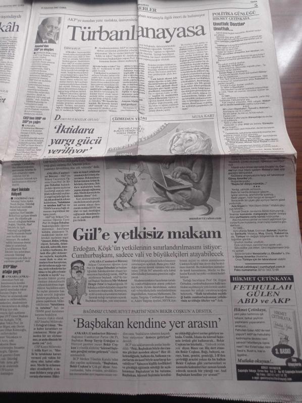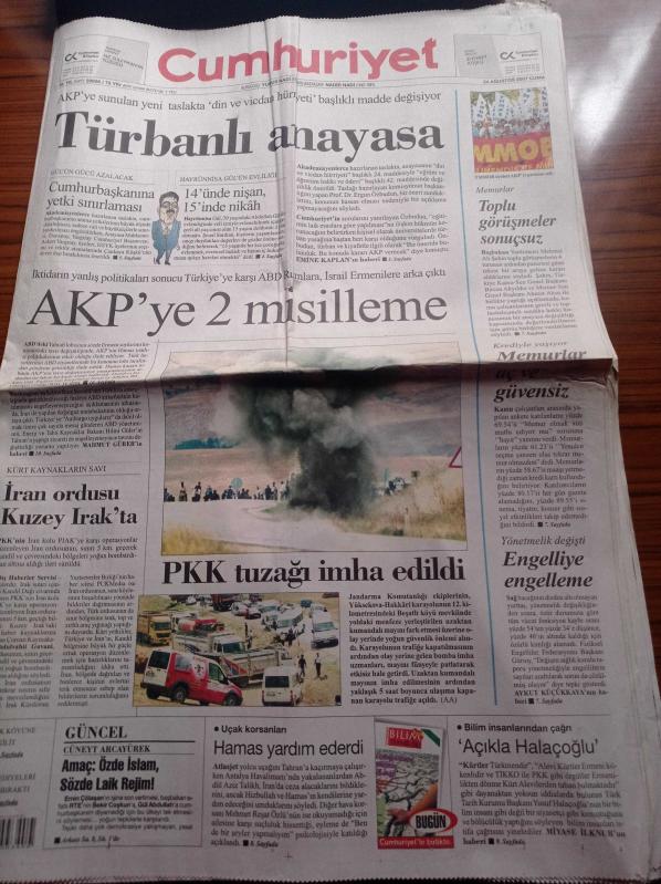 Cumhuriyet Gazetesi - 24 Ağustos 2007 - Fenerbahçe'de Appiah Bilmecesi - Fernando Alonso'dan Yarış Provası - Türbanlı Anayasa - AKP'ye 2 Misilleme - İran Ordusu Kuzey Irak'ta - Uçak Korsanları Hamas Yardım Ederdi - Açıkla Yusuf Halaçoğlu adlı eser Türkçe dilindedir.