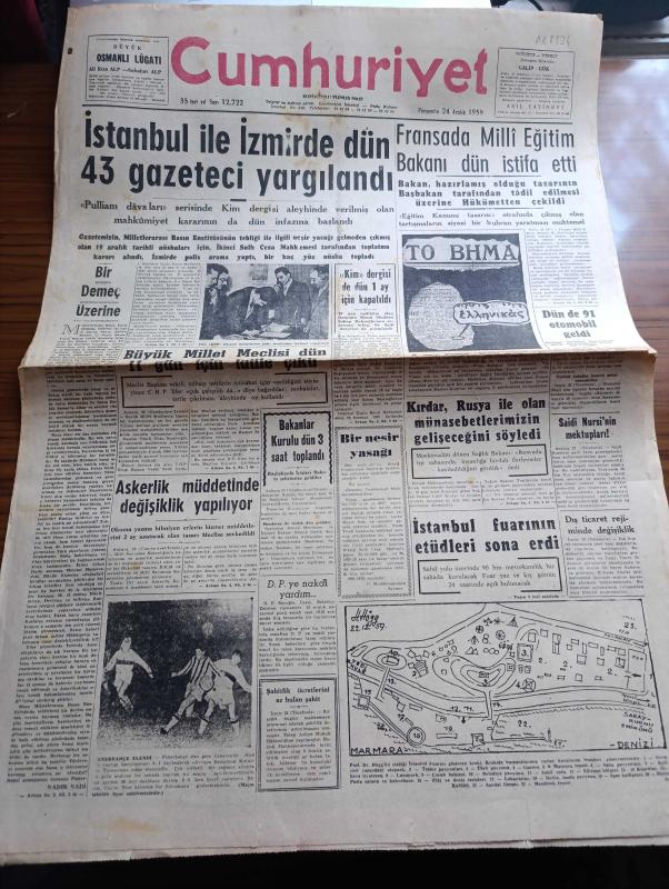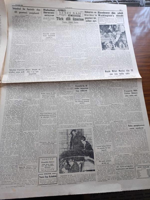 Cumhuriyet Gazetesi - 24 Aralık 1959 - Bir Demeç Üzerine Yazan Nadir Nadi Köşe Yazısı - İstanbul İle İzmir'de Dün 43 Gazeteci Yargılandı - Pulliam Davaları - Dün Kim Dergisi Mesullerine Polis Tarafından Tebligat Yapılırken Fotoğrafı - Kim Dergisi De Dün 1 Ay İçin Kapatıldı - Fransa'da Milli Eğitim Bakanı Dün İstifa Etti - Nice'i 5 1 Yenilen Fenerbahçe Elendi Fotoğrafı - Sağlık Bakanı Lütfi Kırdar Rusya İle Olan Münasebetlerimizin Gelişeceğini Söyledi - Saidi Nursi'nin Mektupları - İstanbul Fuarını Gösteren Kroki - Modern Ekmek Fabrikaları Kuruluyor - 1960 Bütçesi Yazan Osman Okyar - Divan Oteli - Kumar Salgını Yazan Burhan Felek Köşe Yazısı - Papa Komünizme Çattı - Darwin'in Meşhur Nazariyesinin 100. Yıldönümü Günlerindeyiz - Günah Gemisi Filmi Bu Hafta Süreyya'da - Yeni Tiyatroda Tahtaravalli Yazan Çetin Altan - 1959 1960 Yunus Nadi Armağanı Dil Davamız Türk Dili Üzerine Yazan Zekai Turan - Galatasaray İstanbulspor Maçının Biletleri Çift Tarifeli - Agah Erozan - Boks Federasyonu, Yunus Nadi tarafından kaleme alınmıştır. Cumhuriyet Gazetesi - 24 Aralık 1959 - Bir Demeç Üzerine Yazan Nadir Nadi Köşe Yazısı - İstanbul İle İzmir'de Dün 43 Gazeteci Yargılandı - Pulliam Davaları - Dün Kim Dergisi Mesullerine Polis Tarafından Tebligat Yapılırken Fotoğrafı - Kim Dergisi De Dün 1 Ay İçin Kapatıldı - Fransa'da Milli Eğitim Bakanı Dün İstifa Etti - Nice'i 5 1 Yenilen Fenerbahçe Elendi Fotoğrafı - Sağlık Bakanı Lütfi Kırdar Rusya İle Olan Münasebetlerimizin Gelişeceğini Söyledi - Saidi Nursi'nin Mektupları - İstanbul Fuarını Gösteren Kroki - Modern Ekmek Fabrikaları Kuruluyor - 1960 Bütçesi Yazan Osman Okyar - Divan Oteli - Kumar Salgını Yazan Burhan Felek Köşe Yazısı - Papa Komünizme Çattı - Darwin'in Meşhur Nazariyesinin 100. Yıldönümü Günlerindeyiz - Günah Gemisi Filmi Bu Hafta Süreyya'da - Yeni Tiyatroda Tahtaravalli Yazan Çetin Altan - 1959 1960 Yunus Nadi Armağanı Dil Davamız Türk Dili Üzerine Yazan Zekai Turan - Galatasaray İstanbulspor Maçının Biletleri Çift Tarifeli - Agah Erozan - Boks Federasyonu adlı eser Türkçe dilindedir.