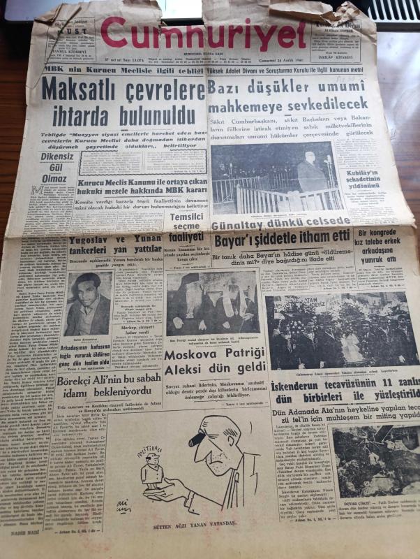 Cumhuriyet Gazetesi - 24 Aralık 1960 - Dikensiz Gül Olmaz Yazan Nadir Nadi Köşe Yazısı - Milli Birlik Komitesi'nin Kurucu Meclisle İlgili Tebliği Maksatlı Çevrelere İhtarda Bulunuldu - Börekçi Ali'nin Bu Sabah İdamı Bekleniyordu - Temsilci Seçme Faaliyeti - Yüksek Adalet Divanı Ve Soruşturma Kurulu İle İlgili Kanunun Metni - Bazı Düşükler Umumî Mahkemeye Sevkedilecek - İnkılap Şehidi Kubilay'ın Şehadetinin Yıldönümü - Şemseddin Günaltay Dünkü Celsede Celal Bayar'ı Şiddetle İtham Etti - Atatürk Heykeline Saldırının 11 Zanlısı Dün Birbirleri İle Yüzleştirildi - Moskova Patriği Aleksi Dün Geldi - 10. Köy Yazan Fakir Baykurt Yazı Dizisi - Amerika'nın En Genç Başkanı Kennedy Hayatı Macera Ve Mücadeleleri Yazan James MacGregor Yazı Dizisi - Ruh Mikropları 147'lerin Affına Dair Yazan Halide Edip Adıvar Köşe Yazısı - Irak'taki Fransız Petrol Hissesinin Millileştirilmesi İsteniyor - Dünyanın En Pahalı Tablosu Somurtan Joconde - Galatasaray Ankaragücü Maçı - Can Bartu -Galatasaray Voleybolcuları adlı eser, Kitap > Süreli Yayınlar > Gazeteler > Türkiye > Genel > Günlük kategorisinde İkinci El olarak satıştadır.