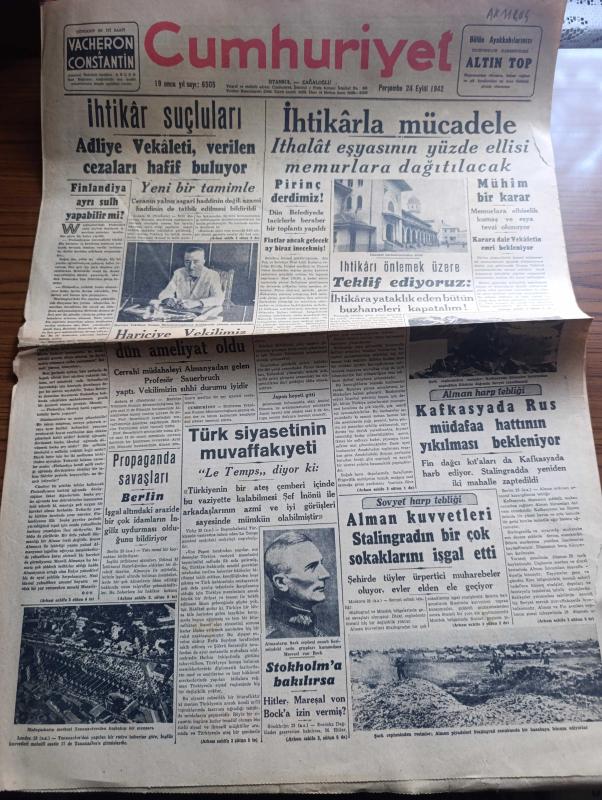 Cumhuriyet Gazetesi - 24 Eylül 1942 - Finlandiya ayrı sulh yapabilir mi Cumhuriyet Başmakale - ihtikar suçluları Adliye vekaleti cezaları hafif buluyor - hariciye vekilimiz Numan Menemencioğlu dün ameliyat oldu fotoğraf - ihtikar ile mücadele ithalat eşyasının yüzde ellisi memurlara dağıtılacak - mühim bir karar memurlara elbiselik kumaş ve eşya tevzi olunuyor - pirinç derdimiz - ihtikara yataklık eden bütün buzhaneleri kapatalım - Alman harp tebliği kafkasya'da Rus müdafaa hattının yıkılması bekleniyor - Sovyet harp tebliği Alman Kuvvetleri Stalingrad'ın birçok sokaklarını işgal etti - Alman piyadeleri Stalingrad cenubunda bir kasabaya hücum ediyorlar fotoğraf - Stockholm'e bakılırsa Hitler Mareşal Von Bock'a izin vermiş - propaganda savaşları Berlin - Le Temps Türk siyasetinin muvaffakiyeti hakkında diyor ki - Memnu Meyva filmi Lale sinemasında - kan vergisi İpek sinemasında - eski Osmanlılarda tiyatro Yazan İsmail Hami Danişmend - Kar İzleri Örttü yazan Henri Bordeaux yazı dizisi, Yunus Nadi tarafından kaleme alınmıştır. Cumhuriyet Gazetesi - 24 Eylül 1942 - Finlandiya ayrı sulh yapabilir mi Cumhuriyet Başmakale - ihtikar suçluları Adliye vekaleti cezaları hafif buluyor - hariciye vekilimiz Numan Menemencioğlu dün ameliyat oldu fotoğraf - ihtikar ile mücadele ithalat eşyasının yüzde ellisi memurlara dağıtılacak - mühim bir karar memurlara elbiselik kumaş ve eşya tevzi olunuyor - pirinç derdimiz - ihtikara yataklık eden bütün buzhaneleri kapatalım - Alman harp tebliği kafkasya'da Rus müdafaa hattının yıkılması bekleniyor - Sovyet harp tebliği Alman Kuvvetleri Stalingrad'ın birçok sokaklarını işgal etti - Alman piyadeleri Stalingrad cenubunda bir kasabaya hücum ediyorlar fotoğraf - Stockholm'e bakılırsa Hitler Mareşal Von Bock'a izin vermiş - propaganda savaşları Berlin - Le Temps Türk siyasetinin muvaffakiyeti hakkında diyor ki - Memnu Meyva filmi Lale sinemasında - kan vergisi İpek sinemasında - eski Osmanlılarda tiyatro Yazan İsmail Hami Danişmend - Kar İzleri Örttü yazan Henri Bordeaux yazı dizisi adlı eser Türkçe dilindedir.
