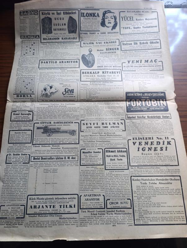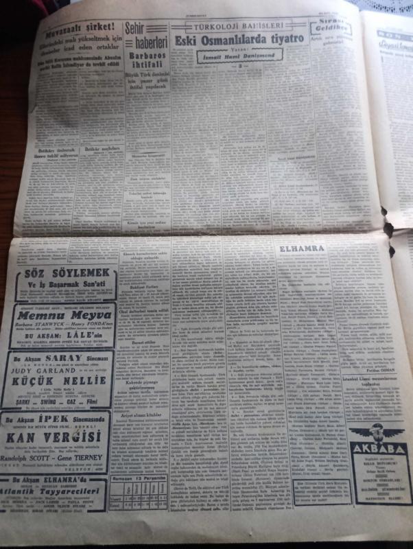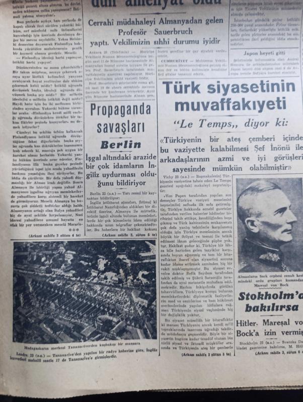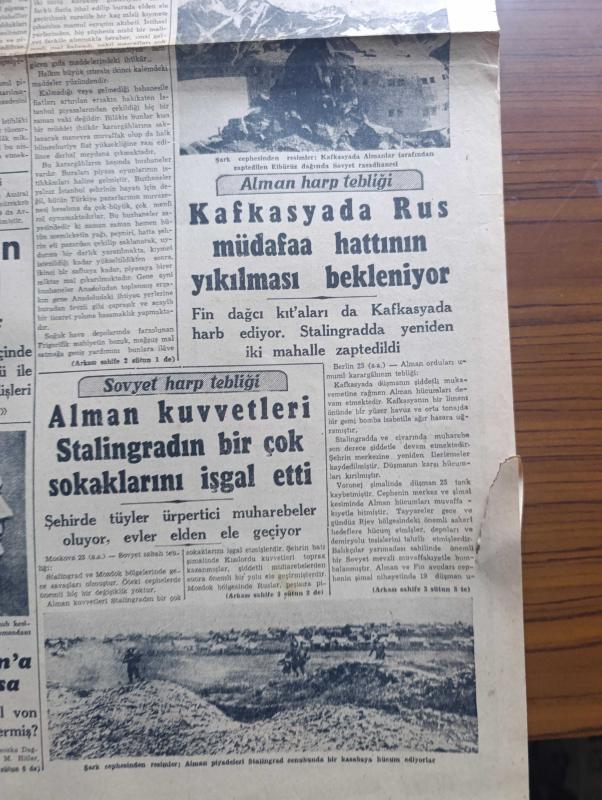 Cumhuriyet Gazetesi - 24 Eylül 1942 - Finlandiya ayrı sulh yapabilir mi Cumhuriyet Başmakale - ihtikar suçluları Adliye vekaleti cezaları hafif buluyor - hariciye vekilimiz Numan Menemencioğlu dün ameliyat oldu fotoğraf - ihtikar ile mücadele ithalat eşyasının yüzde ellisi memurlara dağıtılacak - mühim bir karar memurlara elbiselik kumaş ve eşya tevzi olunuyor - pirinç derdimiz - ihtikara yataklık eden bütün buzhaneleri kapatalım - Alman harp tebliği kafkasya'da Rus müdafaa hattının yıkılması bekleniyor - Sovyet harp tebliği Alman Kuvvetleri Stalingrad'ın birçok sokaklarını işgal etti - Alman piyadeleri Stalingrad cenubunda bir kasabaya hücum ediyorlar fotoğraf - Stockholm'e bakılırsa Hitler Mareşal Von Bock'a izin vermiş - propaganda savaşları Berlin - Le Temps Türk siyasetinin muvaffakiyeti hakkında diyor ki - Memnu Meyva filmi Lale sinemasında - kan vergisi İpek sinemasında - eski Osmanlılarda tiyatro Yazan İsmail Hami Danişmend - Kar İzleri Örttü yazan Henri Bordeaux yazı dizisi adlı eser, Kitap > Süreli Yayınlar > Gazeteler > Türkiye > Genel > Günlük kategorisinde İkinci El olarak satıştadır.