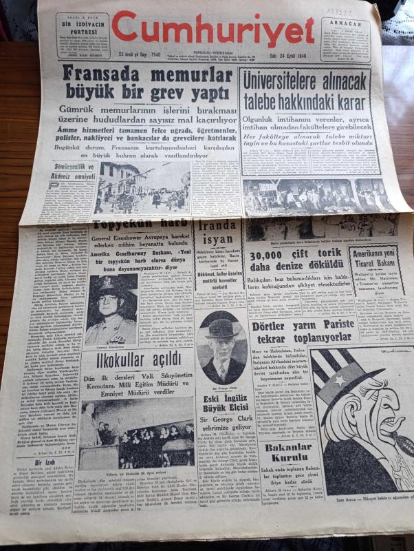 Cumhuriyet Gazetesi - 24 Eylül 1946 - Sömürgecilik Ve Akdeniz Emniyeti Cumhuriyet Başmakale - Fransa'da Memurlar Büyük Bir Grev Yaptı - Üniversitelere Alınacak Talebe Hakkındaki Karar - 30,000 Çift Torik Daha Denize Döküldü - İran'da İsyan - Amerikan Genelkurmay Başkanı Eisenhower Yeni Bir Topyekûn Harp Olursa Dünya Buna Dayanamayacaktır Diyor - İlkokullar Açıldı Dün İlk Dersleri Vali Sıkıyönetim Komutanı Milli Eğitim Müdürü Ve Emniyet Müdürü Verdiler - Sam Amca Karikatür Çizen Cemal Nadir - Kendi Davalarımız Yazan Ahmed Hamdi Başar - İsrail'in Gizli Orduları - Çocuk Tiyatrosu Ve Ses Opereti - Tehlikeli Kadın Bu Akşam Sümer Sinemasında - Safiye Ayla İsmail Dümbüllü Ve Suzan Yakar Beşiktaş Bahçesinde - Yeni Futbol Ve Sportif Komiteleriyle Ceza Heyeti Seçildi - Hamdi Canko - Ulvi Yenal - Yavuz Sultan Selim Ağlıyor Yazan Feridun Fazıl Tülbentçi Yazı Dizisi - Sakızda Türk Yunan Dostluk Tezahürleri - Sınıflara Dönüş Yazan Burhan Felek Köşe Yazısı - Amcabey Ve Sürat Çizen Cemal adlı eser, Kitap > Süreli Yayınlar > Gazeteler > Türkiye > Genel > Günlük kategorisinde İkinci El olarak satıştadır.