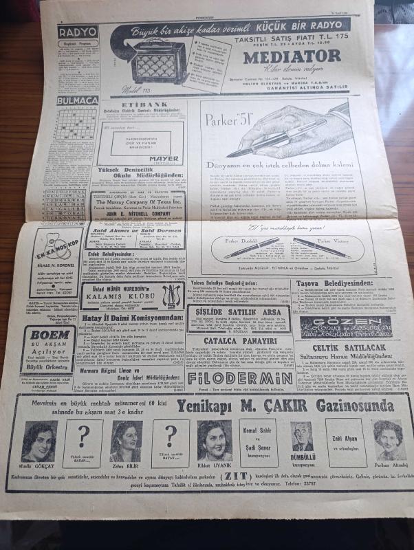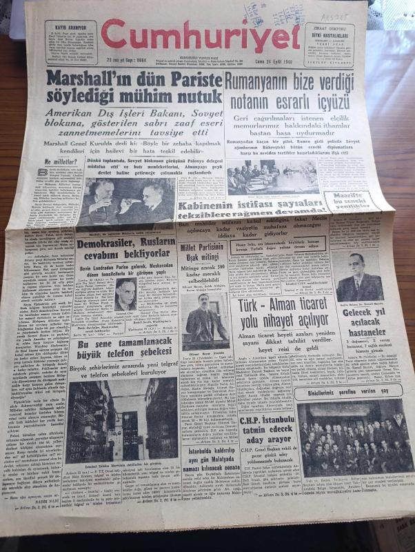 Cumhuriyet Gazetesi - 24 Eylül 1948 - Ne Milletler Yazan Nadir Nadi Başmakale - Marshall'ın Dün Paris'te Söylediği Mühim Nutuk - Romanya'nın Bize Verdiği Notanın Esrarlı İçyüzü - Gelecek Yıl Açılacak Hastaneler - Bu Sene Tamamlanacak Büyük Telefon Şebekesi - Binicilerimiz Şerefine Verilen Çay Fotoğraf - Millet Partisinin Uşak Mitingi - Denizcilik Tarihimizden Altın Sahifeler Yazan Abidin Daver - Dar Yol Yazan Peride Celal Yazı Dizisi - Dostluk Ve Düşmanlık Yazan Burhan Felek Köşe Yazısı - Yıldız Sarayında Operalar Nasıl Hazırlanırdı Yazan Metin Toker - 1948 1949 Yunus Nadi Mükafatı Atatürk'e Ait Bir Hatıra - Türkiye İş Bankası - Bugünkü Radyo Programı - Mediator Kibar Alemin Radyosu - Etibank - Parker 51 Dolma Kalem - Mualla Gökçay Zehra Bilir Dümbüllü Kumpanyası Ve Perihan Altındağ Yenikapı M. Çakır Gazinosunda - Boem Bu Akşam Açılıyor adlı eser, Kitap > Süreli Yayınlar > Gazeteler > Türkiye > Genel > Günlük kategorisinde İkinci El olarak satıştadır.
