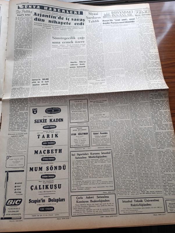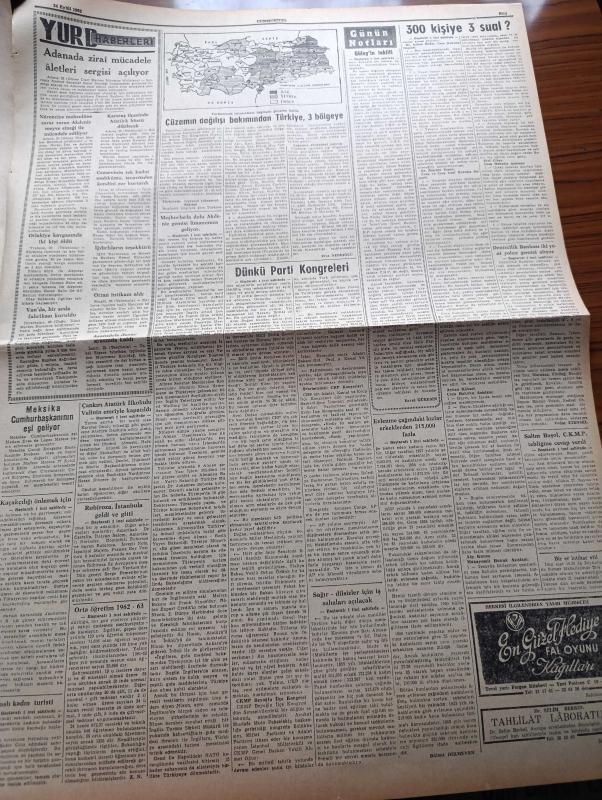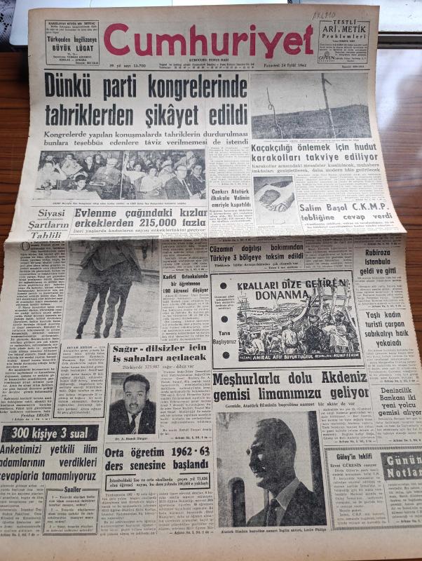 Cumhuriyet Gazetesi - 24 Eylül 1962 - Dünkü Parti Kongrelerinde Tahriklerden Şikayet Edildi - Siyasi Şartların Tahlili Yazan Feridun Ergin Köşe Yazısı - Evlenme Çağındaki Kızlar Erkeklerden 215,000 Fazla - Çankırı Atatürk İlkokulu Valinin Emriyle Kapatıldı - Kaçakçılığı Önlemek İçin Hudut Karakolları Takviye Ediliyor - Salim Başol Cumhuriyetçi Köylü Millet Partisi'nin Tebliğine Cevap Verdi - Cüzamın Dağılışı Bakımından Türkiye 3 Bölgeye Taksim Edildi - Sağır Dilsizler İçin İş Sahaları Açılacak - Yer Demir Gök Bakır Yazan Yaşar Kemal Yazı Dizisi - İlhan Selçuk Köşe Yazısı - Japonya'da 500.000 Yıllık Bir Fil Fosili Meydana Çıkarıldı - Amerika Küba'ya Saldırırsa Füzeler Uçmaya Başlayacak - Savaşçının İstirahatinde Brigitte Bardot ile Robert Hossein Fotoğraf - Gecenin Ucundaki Işık Yazan Peride Celal Yazı Dizisi - Bay Oscar Karikatür - Jane'in Kızı Çizgi Roman - Fenerbahçe 10 Kişilik Yeşil direk'i Yendi - Metin Oktay'sız Galatasaray Karşıyaka'yı Yenemedi adlı eser, Kitap > Süreli Yayınlar > Gazeteler > Türkiye > Genel > Günlük kategorisinde İkinci El olarak satıştadır.