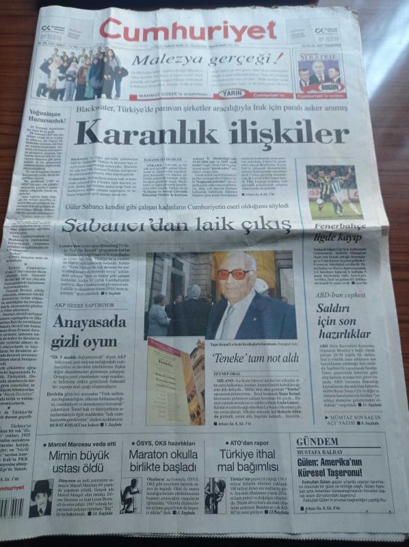 Cumhuriyet Gazetesi - 24 Eylül 2007 - Yönetmen Fatih Akın Türkiye'yi Kötülemedim - Yaşar Kemal'in Teneke'si Tam Not Aldı - Güler Sabancı'dan Laik Çıkış - Anayasada Gizli Oyun - Blackwater Türkiye'de Paravan Şirketler Aracılığıyla Irak İçin Paralı Asker Aramış - Fenerbahçe Lig'de Kayıp - Marcel Marceau Veda Etti adlı eser Türkçe dilindedir.