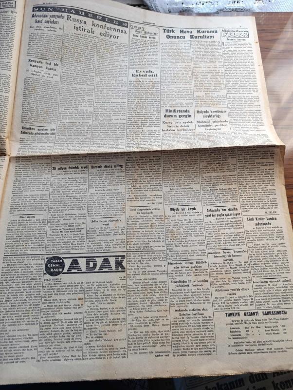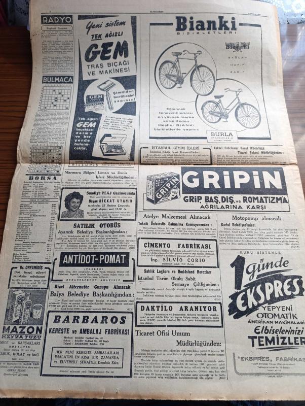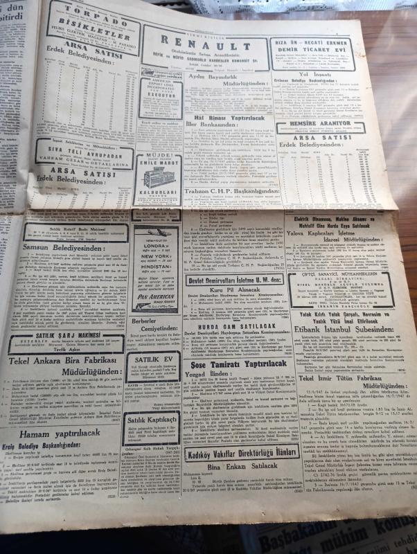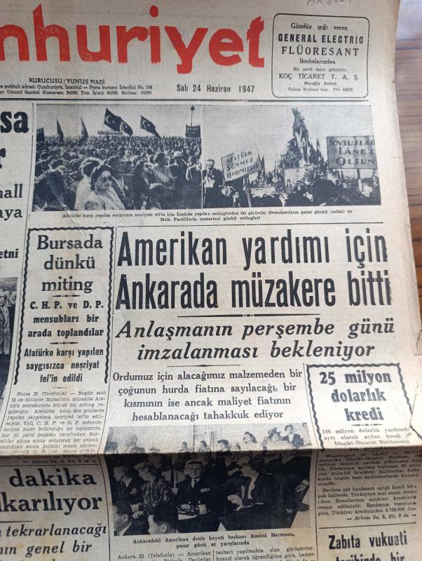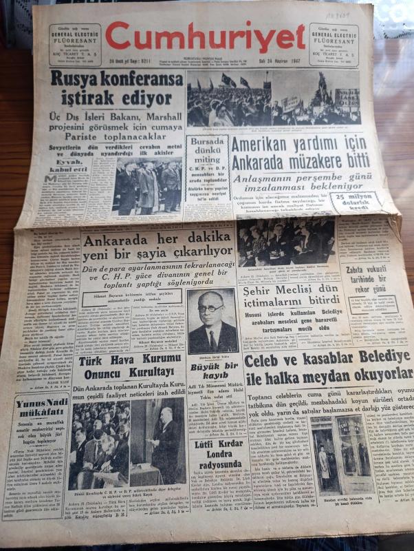 Cumhuriyet Gazetesi - 24 Haziran 1947 - Eyvah Kabul Etti Yazan Nadir Nadi Başmakale - Rusya Konferansa İştirak Ediyor - Atatürk'e Karşı Yapılan Saygısızca Neşriyatı Hem CHP'liler Hem Demokrat Partililer İzmir'de Ayrı Ayrı Telin Etti Fotoğraf - Amerikan Yardımı İçin Ankara'da Müzakere Bitti - Bursa'da Dünkü Miting - Kıymetli İlim Adamı Halit Tekin Vefat Etti - Türk Hava Kurumu Onuncu Kurultayı Fotoğrafı - Lütfi Kırdar Londra Radyosunda - Celep ve Kasaplar Belediye İle Halka Meydan Okuyorlar - Gelir Vergisi Niçin Bize Uymaz Yazan Ahmet Hamdi Başar - Adak Yazan Kemal Ragıp Yazı Dizisi - İnsanın Kuvveti Yazan Burhan Felek Köşe Yazısı - Ayda Sönmez Ve İsmail Dümbüllü Tiyatrosu Suadiye Çınardibi Bahçesinde - Bianki Bisikletleri - Bayan Rikkat Uyanık Suadiye Plaj Gazinosunda - Bugünkü Radyo Programı - Bulmaca - Borsa - Gem Traş Bıçağı Ve Makinesi - Mazon Meyva Tuzu adlı eser, Kitap > Süreli Yayınlar > Gazeteler > Türkiye > Genel > Günlük kategorisinde İkinci El olarak satıştadır.