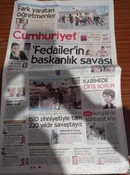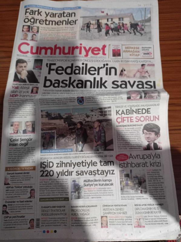 Cumhuriyet Gazetesi - 24 Kasım 2015 - Trabzon Kongresi Öncesi Cumhurbaşkanı Recep Tayyip Erdoğan'a Yakın İki İsim Karşı Karşıya Kaldı - Mustafa Denizli - Selahattin Demirtaş'a Suikast İddiaları - Dışkı Yedirilen Doktor Celal Şengör İnsan Değil - Recep Tayyip Erdoğan İle Ahmet Davutoğlu Arasında Sorun - Ceyda Karan Rojava'da - Sünni Arap Şeyhi El Hadi IŞİD Zihniyetiyle Tam 220 Yıldır Savaştayız - 24 Kasım Öğretmenler Günü - Devlet Tiyatroları Perdeleri Kapatıyor adlı eser Türkçe dilindedir.