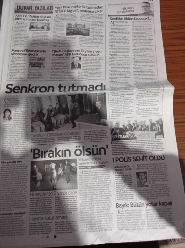 Cumhuriyet Gazetesi - 24 Kasım 2015 - Trabzon Kongresi Öncesi Cumhurbaşkanı Recep Tayyip Erdoğan'a Yakın İki İsim Karşı Karşıya Kaldı - Mustafa Denizli - Selahattin Demirtaş'a Suikast İddiaları - Dışkı Yedirilen Doktor Celal Şengör İnsan Değil - Recep Tayyip Erdoğan İle Ahmet Davutoğlu Arasında Sorun - Ceyda Karan Rojava'da - Sünni Arap Şeyhi El Hadi IŞİD Zihniyetiyle Tam 220 Yıldır Savaştayız - 24 Kasım Öğretmenler Günü - Devlet Tiyatroları Perdeleri Kapatıyor adlı eser, Kitap > Süreli Yayınlar > Gazeteler kategorisinde İkinci El olarak satıştadır.