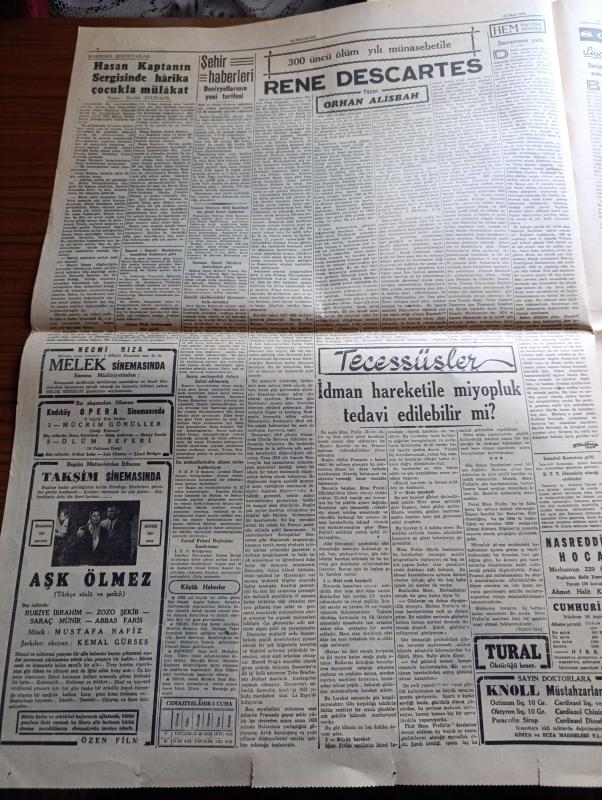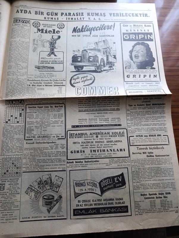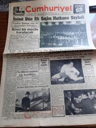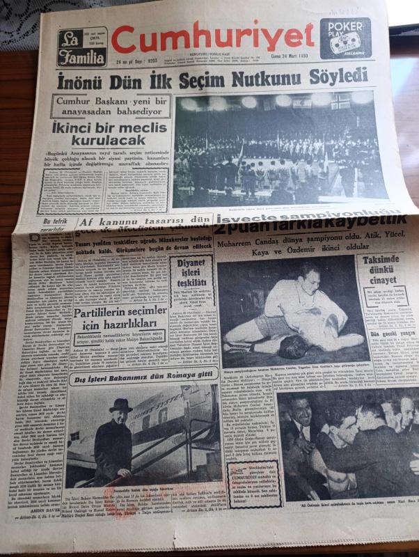 Cumhuriyet Gazetesi - 24 Mart 1950 - bu tefrik zararlıdır yazan Abidin Daver Başmakale - İsmet İnönü Dün ilk seçim nutkunu söyledi - İkinci bir meclis kurulacak - Stockholmde yapılan dünya Greko Romen güreş birinciliklerinin açılış merasimi fotoğraf - dünya şampiyonluğunu kazanan Muharrem Candaş Yugoslav Ivan Gottbar'ı tuşa getirmeye çalışırken fotoğraf - Ali Özdemir ikinci müsabakasını da tuşla kazandıktan sonra Nuri hoca ile kucaklaşıyor fotoğraf - af kanunu tasarısı Dün gece de meclisten çıkmadı - 300. ölüm yılı münasebetiyle Rene Descartes Yazan Orhan Alisbah - Aşk ölmez filmi başrollerde Rukiye İbrahim Zozo Şekip Saraç Münir Abbas Faris Taksim sinemasında - Üç Silahşörler yazan Alexandre Dumas - Demokrat Parti eşya piyangosu - İstanbul Ankara Radyosu Programı - Bulmaca - Commer Kamyon - Dünya İkinciliğini kazanan Celal Atik yugoslavyalıyı tuşla yenmeye çalışırken fotoğraf - Stockholmdeki dünya güreş şampiyonasının dün akşam uçakla gelen ilk resimleri - Güreşçi Ali Yücel Fotoğraf adlı eser, Kitap > Süreli Yayınlar > Gazeteler > Türkiye > Genel > Günlük kategorisinde İkinci El olarak satıştadır.