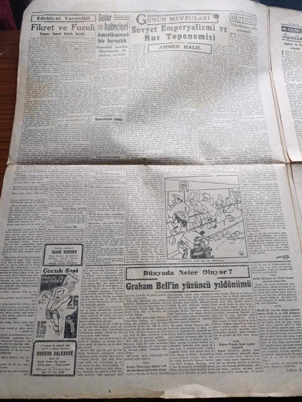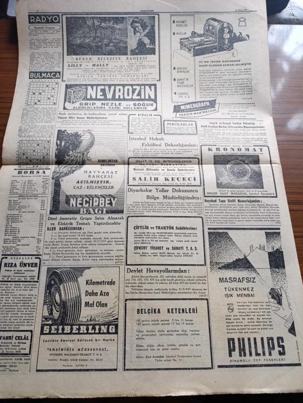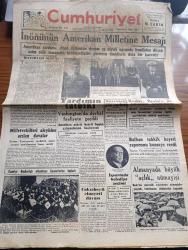 Cumhuriyet Gazetesi - 24 Mayıs 1947 - Hayırlısı Olsun Yazan Nadir Nadi Köşe Yazısı - İsmet İnönü'nün Amerikan Milletine Mesajı - Evvelki Gün Ankara'ya Gelen Amerikan Askeri Heyetine Aid Resimler - Ruslar Bevin'e De Hücuma Başladılar - Isparta'da Belediye Seçimi - Şükrü Sökmensüer - Cumhurbaşkanlığı Orkestrası Konserlerine Başladı Fotoğraf - Çakırbeyli Cinayeti Davası - Fikret Ve Fuzuli Yazan İsmail Habib Sevük - Graham Bell'in Yüzüncü Yıldönümü - Çatalca Elektrik Santrali Açıldı - Sovyet Emperyalizmi Ve Rus Toponomisi Yazan Ahmed Halil - Telif Roman Adak Yazan Kemal Ragıb Hulusinin Yazı Dizisi - Denizden Gidip Havadan Döndük Yazan Burhan Felek Köşe Yazısı - Su Perileri Filmi Bugün İpek Sinemasında - Warner Williams - Küçük Hikâye Şimdi Beyhan Var Yazan F. Celaleddin - Liseler Atletizm Müsabakaları Yapıldı - Üsküdar Halkevi Spor Bayramı - Reo Kamyonları - Kibar Tuvalet Sabunu - Klasik Çigan Ve Caz Orkestrası Bebek Belediye Bahçesinde - Bugünkü Radyo Programı - Bulmaca adlı eser, Kitap > Süreli Yayınlar > Gazeteler > Türkiye > Genel > Günlük kategorisinde İkinci El olarak satıştadır.