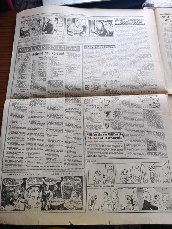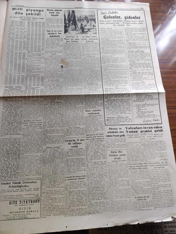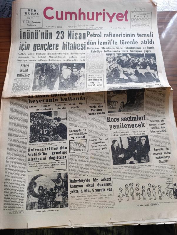 Cumhuriyet Gazetesi - 24 Nisan 1960 - kişiyi nasıl bilirsin yazan Nadir Nadi Başmakale - İsmet İnönü'nün 23 Nisan için gençlere Hitabesi Fotoğraf - cumhurbaşkanı Celal Bayar Dün çocukları kabul ediyor fotoğraf - 23 Nisan bütün yurtta heyecanla kutlandı - üniversiteliler Dün Atatürk'ün gençliğe hitabesini dağıttılar - Gebze'de yapılan 23 Nisan merasimi fotoğraf - Petrol zaferisinin temeli Dün İzmit'te Başbakan Adnan Menderes'in katılımıyla atıldı fotoğraf - Mazlum Kayalar'ın eşi Melahat Kayalar Dün İsmet İnönü'ye bağlılık telgrafı çekti - Kore seçimleri yenilenecek - Kıbrıs'ta EOKA mensupları yine faaliyete geçti - Evlerden Biri yazan Orhan Kemal Yazı Dizisi - Amerika'da tiyatro yazan Muhsin Ertuğrul - Devlet Tiyatrosu şan sinemasında Arzu tramvayı - Tosca rolü ile Opera sahnesine ilk defa çıkarak başarı kazanan soprano Meral Menderes fotoğraf - Kleopatra meselesi devam ediyor - tevhit bilge tiyatrosu - haftanın şakaları yazan Burhan Felek - Galatasaray Karşıyaka'yı 5-0 yendi, Yunus Nadi tarafından kaleme alınmıştır. Cumhuriyet Gazetesi - 24 Nisan 1960 - kişiyi nasıl bilirsin yazan Nadir Nadi Başmakale - İsmet İnönü'nün 23 Nisan için gençlere Hitabesi Fotoğraf - cumhurbaşkanı Celal Bayar Dün çocukları kabul ediyor fotoğraf - 23 Nisan bütün yurtta heyecanla kutlandı - üniversiteliler Dün Atatürk'ün gençliğe hitabesini dağıttılar - Gebze'de yapılan 23 Nisan merasimi fotoğraf - Petrol zaferisinin temeli Dün İzmit'te Başbakan Adnan Menderes'in katılımıyla atıldı fotoğraf - Mazlum Kayalar'ın eşi Melahat Kayalar Dün İsmet İnönü'ye bağlılık telgrafı çekti - Kore seçimleri yenilenecek - Kıbrıs'ta EOKA mensupları yine faaliyete geçti - Evlerden Biri yazan Orhan Kemal Yazı Dizisi - Amerika'da tiyatro yazan Muhsin Ertuğrul - Devlet Tiyatrosu şan sinemasında Arzu tramvayı - Tosca rolü ile Opera sahnesine ilk defa çıkarak başarı kazanan soprano Meral Menderes fotoğraf - Kleopatra meselesi devam ediyor - tevhit bilge tiyatrosu - haftanın şakaları yazan Burhan Felek - Galatasaray Karşıyaka'yı 5-0 yendi adlı eser Türkçe dilindedir.