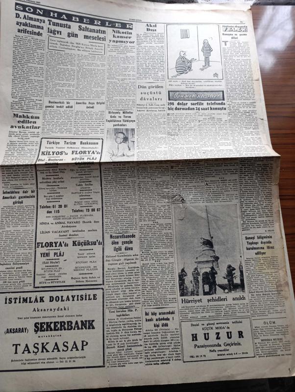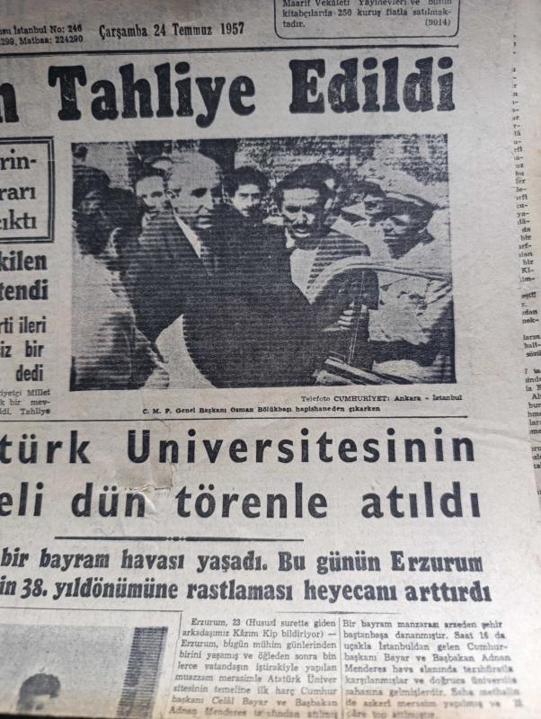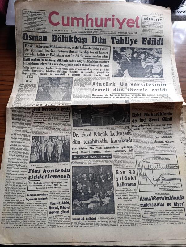 Cumhuriyet Gazetesi - 24 Temmuz 1957 - Akıl Dışı yazan Nadir Nadi Başmakale - Osman Bölükbaşı Dün Tahliye Edildi Fotoğrafı - Erzurum'da Atatürk Üniversitesinin Temeli Dün Törenle Atıldı - Doktor Fazıl Küçük Lefkoşe'de Dün Tezahüratla Karşılandı - Lozan'ın 34. Yıldönümü fotoğraf - Eski Muharebelerinde 45. Şeref Günü - İstanbul'da Yapılacak Asma Köprü Hakkında Mütehassıslar Ne Diyor - bir asma köprü projesi -Hürriyet şehitleri anıldı fotoğraf -Yanlış Zifaf Yazan Kemal Bilbaşar Yazı Dizisi - Taksim Ve Sultanahmet Meydanları - Tunus'ta Saltanatın Lağvı Gün Meselesi - Amerika Asya Gripini Önledi - Sanayi Bölgesinin Topkapı Dışında Kurulmasına İtiraz Ediliyor - Ankara İstanbul Radyosu Programı - Mithatpaşa Kupası Yüzme Yarışları Dün Modada Yapıldı - Selma Hassan 200 Metrede Yeni Bir Rekor Daha Kırdı - Dolmabahçe Atadı Mesele Oluyor - Eşref Özmenç Vefaya Girdi Tekin Bilge Gençlerbirliğine Döndü - Tenis Çalenç Kupası Maçları - Ok Sporumuz İhya Ediliyor - Türk İran Ordu Atletizm Teması, Yunus Nadi tarafından kaleme alınmıştır. Cumhuriyet Gazetesi - 24 Temmuz 1957 - Akıl Dışı yazan Nadir Nadi Başmakale - Osman Bölükbaşı Dün Tahliye Edildi Fotoğrafı - Erzurum'da Atatürk Üniversitesinin Temeli Dün Törenle Atıldı - Doktor Fazıl Küçük Lefkoşe'de Dün Tezahüratla Karşılandı - Lozan'ın 34. Yıldönümü fotoğraf - Eski Muharebelerinde 45. Şeref Günü - İstanbul'da Yapılacak Asma Köprü Hakkında Mütehassıslar Ne Diyor - bir asma köprü projesi -Hürriyet şehitleri anıldı fotoğraf -Yanlış Zifaf Yazan Kemal Bilbaşar Yazı Dizisi - Taksim Ve Sultanahmet Meydanları - Tunus'ta Saltanatın Lağvı Gün Meselesi - Amerika Asya Gripini Önledi - Sanayi Bölgesinin Topkapı Dışında Kurulmasına İtiraz Ediliyor - Ankara İstanbul Radyosu Programı - Mithatpaşa Kupası Yüzme Yarışları Dün Modada Yapıldı - Selma Hassan 200 Metrede Yeni Bir Rekor Daha Kırdı - Dolmabahçe Atadı Mesele Oluyor - Eşref Özmenç Vefaya Girdi Tekin Bilge Gençlerbirliğine Döndü - Tenis Çalenç Kupası Maçları - Ok Sporumuz İhya Ediliyor - Türk İran Ordu Atletizm Teması adlı eser Türkçe dilindedir.