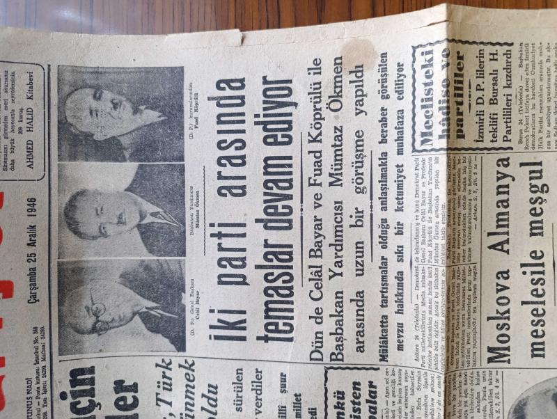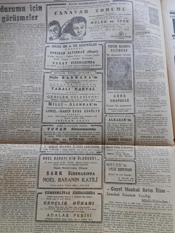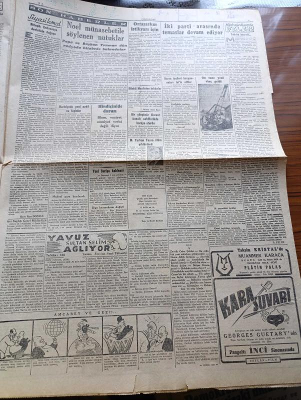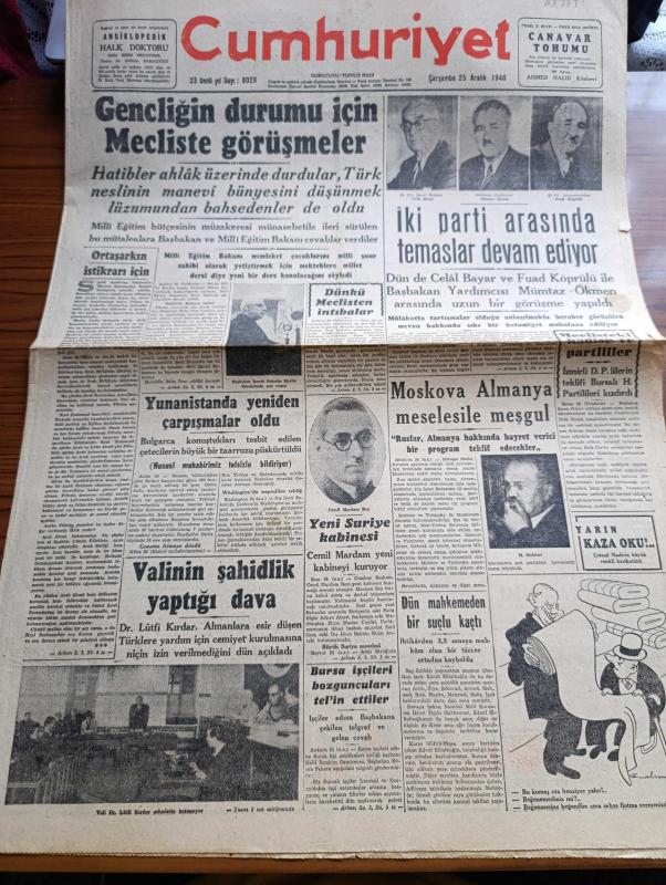 Cumhuriyet Gazetesi - 25 Aralık 1946 - Ortaşarkın İstikrarı İçin Köşe Yazısı - Vali Doktor Lütfi Kırdar'ın Şahitlik Yaptığı Dava Fotoğraf - Dün De Celal Bayar Ve Fuad Köprülü İle Başbakan Yardımcısı Mümtaz Ökmen Arasında Uzun Bir Görüşme Yapıldı - Suriye'de Cemil Mardam Yeni Kabineyi Kuruyor - Moskova Almanya Meselesiyle Meşgul - Bursa İşçileri Bozguncuları Tel'in Etti - Türk Sanatı Adlı Eseriyle Profesör Diez İddialarını İspat Etmelidir Yazan Tahsin Öz - Cenubi Amerika'da Türk Bayrağı - Papa Ve Başkan Truman Noel Münasebetiyle Radyoda Hitabede Bulundular - Yavuz Sultan Selim Ağlıyor Yazan Feridun Fazıl Tülbentçi Yazı Dizisi - Tophane Gümrüğünde Çalışmaya Başlayan Yeni Vinçlerden Biri Fotoğraf - Yaralı Kartal Bugün Marmara Sinemasında - Canavar Tohumu Filmi Melek Ve İpek Sinemasında - Bugün İnci Lüks Pastanesi Açıldı - Bugünkü Radyo Programı - Bulmaca - Star Traş Bıçağı - Hussman Soğutma Cihazları - Sadi Işılay Ve Mustafa Çağlar Maksimde, Yunus Nadi tarafından kaleme alınmıştır. Cumhuriyet Gazetesi - 25 Aralık 1946 - Ortaşarkın İstikrarı İçin Köşe Yazısı - Vali Doktor Lütfi Kırdar'ın Şahitlik Yaptığı Dava Fotoğraf - Dün De Celal Bayar Ve Fuad Köprülü İle Başbakan Yardımcısı Mümtaz Ökmen Arasında Uzun Bir Görüşme Yapıldı - Suriye'de Cemil Mardam Yeni Kabineyi Kuruyor - Moskova Almanya Meselesiyle Meşgul - Bursa İşçileri Bozguncuları Tel'in Etti - Türk Sanatı Adlı Eseriyle Profesör Diez İddialarını İspat Etmelidir Yazan Tahsin Öz - Cenubi Amerika'da Türk Bayrağı - Papa Ve Başkan Truman Noel Münasebetiyle Radyoda Hitabede Bulundular - Yavuz Sultan Selim Ağlıyor Yazan Feridun Fazıl Tülbentçi Yazı Dizisi - Tophane Gümrüğünde Çalışmaya Başlayan Yeni Vinçlerden Biri Fotoğraf - Yaralı Kartal Bugün Marmara Sinemasında - Canavar Tohumu Filmi Melek Ve İpek Sinemasında - Bugün İnci Lüks Pastanesi Açıldı - Bugünkü Radyo Programı - Bulmaca - Star Traş Bıçağı - Hussman Soğutma Cihazları - Sadi Işılay Ve Mustafa Çağlar Maksimde adlı eser Türkçe dilindedir.