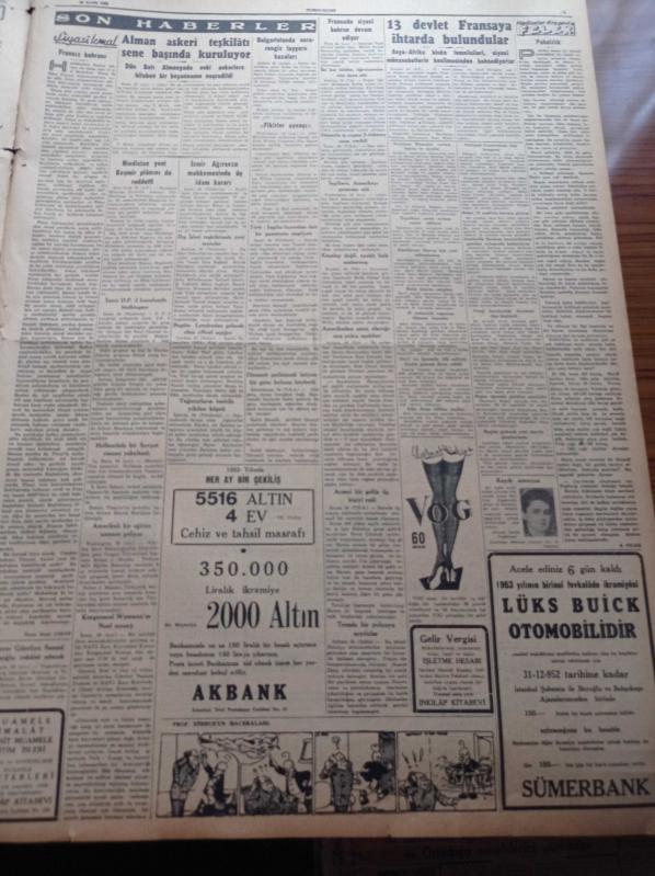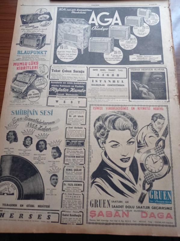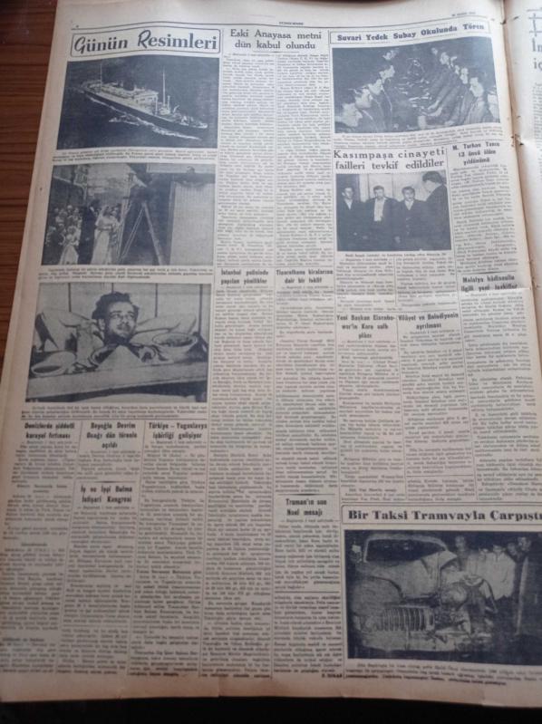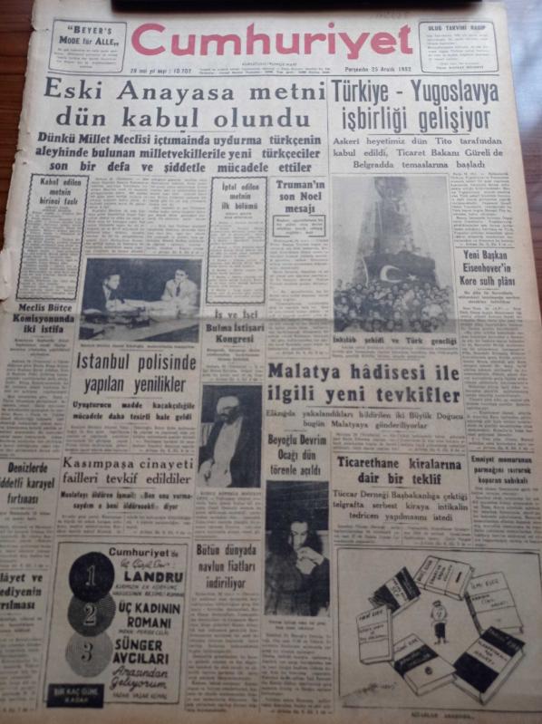 Cumhuriyet Gazetesi - 25 Aralık 1952 - Eski Anayasa Metni Dün Kabul Olundu - Türkiye Yugoslavya İşbirliği Gelişiyor - Amerikan Başkanı Truman'ın Son Noel Mesajı - Yeni Amerikan Başkanı Eisenhover'in Kore Sulh Planı Beyoğlu Devrim Ocağı Dün Törenle Açıldı - Malatya Hadisesi İle İlgili Yeni Tevkifler - İstanbul Polisinde Yapılan Yenilikler - Bedri Rahmi Eyüboğlu Sanat Bahisleri - Hitler İntihar Kararını Ne Zaman Vermişti - Kodak Fotoğraf Makinesi - Çamlıca Kız Lisesi Şampiyon Oldu - Taksim Sineması - Geliri Atatürk Heykeline Harcanacak Atatürk Kupası - İngiliz Edebiyatının Kör Dahisi John Milton - Gripin - Çapamarka - Titanik Vapurunun İkinci Kaptanı Yeni Öldü - Günün Resimleri - Kovo Sayaç Ve Ölçü Aletleri - Arı Bisküvileri - Baysal Çiçek Mağazası - Jawa Motosikletleri - M. Turhan Tan'ın 13. Ölüm Yıldönümü- AGA Radyo - Gruen Saatleri - Hamiyet Yüceses - Perihan Altındağ Sözeri - Sabite Tur Gülerman - Zeki Müren, Yunus Nadi tarafından kaleme alınmıştır. Cumhuriyet Gazetesi - 25 Aralık 1952 - Eski Anayasa Metni Dün Kabul Olundu - Türkiye Yugoslavya İşbirliği Gelişiyor - Amerikan Başkanı Truman'ın Son Noel Mesajı - Yeni Amerikan Başkanı Eisenhover'in Kore Sulh Planı Beyoğlu Devrim Ocağı Dün Törenle Açıldı - Malatya Hadisesi İle İlgili Yeni Tevkifler - İstanbul Polisinde Yapılan Yenilikler - Bedri Rahmi Eyüboğlu Sanat Bahisleri - Hitler İntihar Kararını Ne Zaman Vermişti - Kodak Fotoğraf Makinesi - Çamlıca Kız Lisesi Şampiyon Oldu - Taksim Sineması - Geliri Atatürk Heykeline Harcanacak Atatürk Kupası - İngiliz Edebiyatının Kör Dahisi John Milton - Gripin - Çapamarka - Titanik Vapurunun İkinci Kaptanı Yeni Öldü - Günün Resimleri - Kovo Sayaç Ve Ölçü Aletleri - Arı Bisküvileri - Baysal Çiçek Mağazası - Jawa Motosikletleri - M. Turhan Tan'ın 13. Ölüm Yıldönümü- AGA Radyo - Gruen Saatleri - Hamiyet Yüceses - Perihan Altındağ Sözeri - Sabite Tur Gülerman - Zeki Müren adlı eser Türkçe dilindedir.