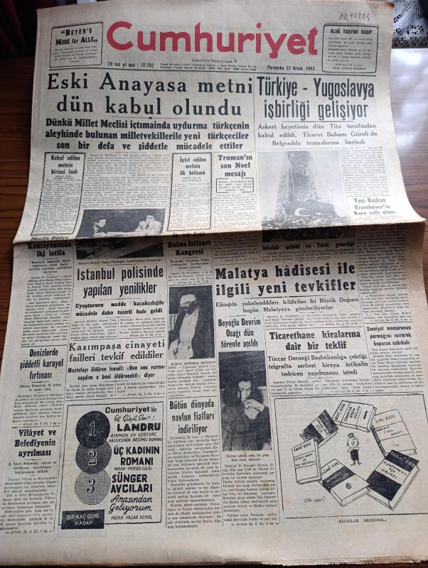 Cumhuriyet Gazetesi - 25 Aralık 1952 - Eski Anayasa Metni Dün Kabul Olundu - Türkiye Yugoslavya İşbirliği Gelişiyor - Amerikan Başkanı Truman'ın Son Noel Mesajı - Yeni Amerikan Başkanı Eisenhover'in Kore Sulh Planı - Beyoğlu Devrim Ocağı Dün Törenle Açıldı fotoğraf - Malatya Hadisesi İle İlgili Yeni Tevkifler - İki Büyük Doğucu Bugün Malatya'ya gönderiliyor -İstanbul Polisinde Yapılan Yenilikler - Emniyet Müdürü Ahmet Tekelioğlu yazarımızda görüşürken fotoğraf - Bedri Rahmi Eyüboğlu Sanat Bahisleri - Hitler İntihar Kararını Ne Zaman Vermişti - Kodak Fotoğraf Makinesi - Çamlıca Kız Lisesi Şampiyon Oldu - Taksim Sineması - Geliri Atatürk Heykeline Harcanacak Atatürk Kupası - İngiliz Edebiyatının Kör Dahisi John Milton - Gripin - Çapamarka - Titanik Vapurunun İkinci Kaptanı Yeni Öldü - Günün Resimleri - AGA Radyo - Hamiyet Yüceses Perihan Altındağ Sözeri Sabite Tur Gülerman Zeki Müren plakları sahibinin sesinde - Alaaddin'in lambası filmi Kemal film tamamen renkli - Tokat çoban sucuğu, Yunus Nadi tarafından kaleme alınmıştır. Cumhuriyet Gazetesi - 25 Aralık 1952 - Eski Anayasa Metni Dün Kabul Olundu - Türkiye Yugoslavya İşbirliği Gelişiyor - Amerikan Başkanı Truman'ın Son Noel Mesajı - Yeni Amerikan Başkanı Eisenhover'in Kore Sulh Planı - Beyoğlu Devrim Ocağı Dün Törenle Açıldı fotoğraf - Malatya Hadisesi İle İlgili Yeni Tevkifler - İki Büyük Doğucu Bugün Malatya'ya gönderiliyor -İstanbul Polisinde Yapılan Yenilikler - Emniyet Müdürü Ahmet Tekelioğlu yazarımızda görüşürken fotoğraf - Bedri Rahmi Eyüboğlu Sanat Bahisleri - Hitler İntihar Kararını Ne Zaman Vermişti - Kodak Fotoğraf Makinesi - Çamlıca Kız Lisesi Şampiyon Oldu - Taksim Sineması - Geliri Atatürk Heykeline Harcanacak Atatürk Kupası - İngiliz Edebiyatının Kör Dahisi John Milton - Gripin - Çapamarka - Titanik Vapurunun İkinci Kaptanı Yeni Öldü - Günün Resimleri - AGA Radyo - Hamiyet Yüceses Perihan Altındağ Sözeri Sabite Tur Gülerman Zeki Müren plakları sahibinin sesinde - Alaaddin'in lambası filmi Kemal film tamamen renkli - Tokat çoban sucuğu adlı eser Türkçe dilindedir.