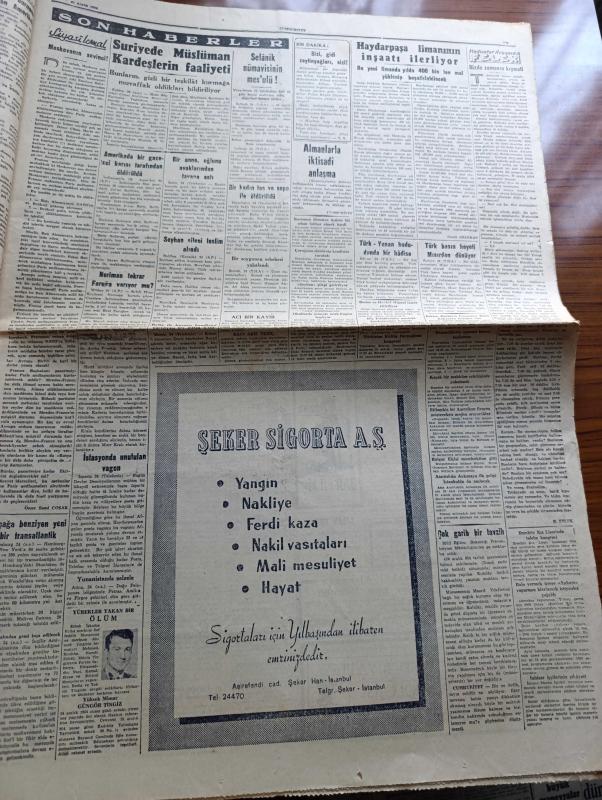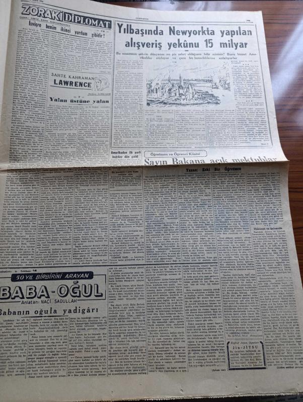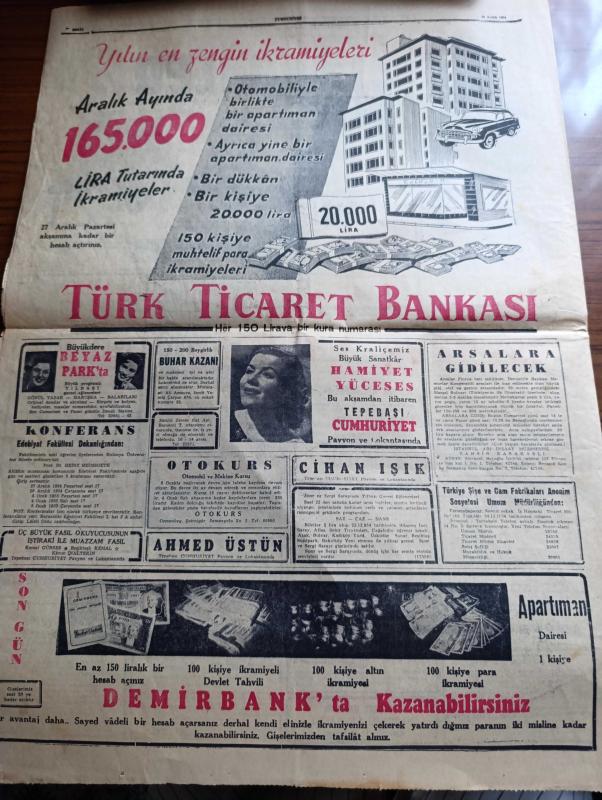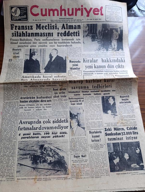 Cumhuriyet Gazetesi - 25 Aralık 1954 - Almanlarla İktisadi Anlaşma Cumhuriyet Başmakale - Fransız Meclisi Alman Silahlanmasını Reddetti - Celal Bayar Üçüncü Ordu Birlikleri Teftiş Etti Fotoğraf - Paris Antlaşmalarının İmzalandığı Gün Fransız Ve Alman Başbakanları Elele Fotoğraf - Atatürk'ün Kızkardeşi Makbule Atadan Hazine Aleyhine Dava Açtı - Bugün Noel- Zeki Müren Cahide Sonkudan 32.000 Lira Tazminat İstiyor - Başvekil Adnan Menderes Bugün İstanbul'da - Kiralar Hakkındaki Yeni Kanun Dün Çıktı - Türk İsrail Ticaret Münasebeti Gelişiyor - Yakacık Sanatoryumu Kapanıyor - Suriye'de Müslüman Kardeşlerin Faaliyeti - Haydarpaşa Limanının İnşaatı İlerliyor - Bizde Zamanın Kıymeti Yazan Burhan Felek - Fenerbahçe Bugün Beykozla Karşılaşıyor - Şeref Stadında Adalet Kasımpaşa Maçı - Demir Maske Filmi Çemberlitaş Sinemasında - Zoraki Diplomat Yazan Yakup Kadri Karaosmanoğlu Yazı Dizisi - Sahte Kahraman Lawrence Derleyen Samih Sami Yazı Dizisi - Tarihe Geçmiş Büyük Aşklar Tristan Ve İzolda adlı eser, Kitap > Süreli Yayınlar > Gazeteler > Türkiye > Genel > Günlük kategorisinde İkinci El olarak satıştadır.