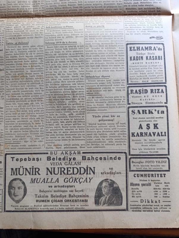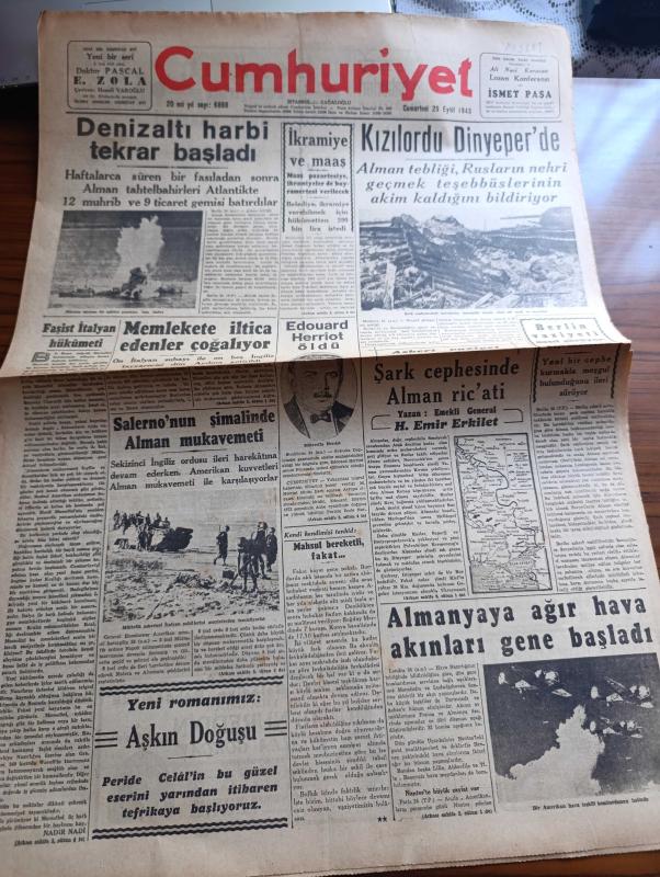 Cumhuriyet Gazetesi - 25 Eylül 1943 - faşist İtalyan hükümeti yazan Nadir Nadi Başmakale - denizaltı harbi tekrar başladı - hücuma uğrayan bir nakliye gemisine tam isabet fotoğraf - Kızılordu Dinyeper'de - şark cephesindeki harekatta tamamıyla harap olan bir tank ve mevziler fotoğraf - Edouard Herriot Öldü - müttefik askerleri İtalyan sahillerini mayınlardan temizliyor fotoğraf - Salerno'nun şimalinde Alman mukavemeti - askeri vaziyet şark cephesinde Alman Ricati yazan emekli general H. Emir Erkilet - Almanya'ya ağır hava akınları gene başladı - Münir Nurettin Selçuk Ben Mualla Gökçay bu akşam Tepebaşı belediye bahçesinde - Sezarın panejirigi 1919 İtalyan Anarşisi yazan Şükrü Kaya - Adalar şarkısı Melek sinemasında - kadın kasabı filmi elhamra'da - yugoslavya'da çete hareketleri büyüyor - Hamiyet Yüceses Cağaloğlu çiftesaraylar bahçesinde - Galatasaray'ın Kongresi - Selahattin Almay istanbulspor'a antrenör oldu - Fenerbahçe Beykoz maçı - Galatasaray Anadolu Hisarı maçı - Nubar Tekyay, Yunus Nadi tarafından kaleme alınmıştır. Cumhuriyet Gazetesi - 25 Eylül 1943 - faşist İtalyan hükümeti yazan Nadir Nadi Başmakale - denizaltı harbi tekrar başladı - hücuma uğrayan bir nakliye gemisine tam isabet fotoğraf - Kızılordu Dinyeper'de - şark cephesindeki harekatta tamamıyla harap olan bir tank ve mevziler fotoğraf - Edouard Herriot Öldü - müttefik askerleri İtalyan sahillerini mayınlardan temizliyor fotoğraf - Salerno'nun şimalinde Alman mukavemeti - askeri vaziyet şark cephesinde Alman Ricati yazan emekli general H. Emir Erkilet - Almanya'ya ağır hava akınları gene başladı - Münir Nurettin Selçuk Ben Mualla Gökçay bu akşam Tepebaşı belediye bahçesinde - Sezarın panejirigi 1919 İtalyan Anarşisi yazan Şükrü Kaya - Adalar şarkısı Melek sinemasında - kadın kasabı filmi elhamra'da - yugoslavya'da çete hareketleri büyüyor - Hamiyet Yüceses Cağaloğlu çiftesaraylar bahçesinde - Galatasaray'ın Kongresi - Selahattin Almay istanbulspor'a antrenör oldu - Fenerbahçe Beykoz maçı - Galatasaray Anadolu Hisarı maçı - Nubar Tekyay adlı eser Türkçe dilindedir.