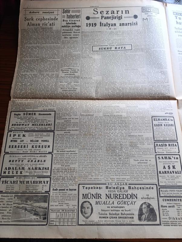 Cumhuriyet Gazetesi - 25 Eylül 1943 - faşist İtalyan hükümeti yazan Nadir Nadi Başmakale - denizaltı harbi tekrar başladı - hücuma uğrayan bir nakliye gemisine tam isabet fotoğraf - Kızılordu Dinyeper'de - şark cephesindeki harekatta tamamıyla harap olan bir tank ve mevziler fotoğraf - Edouard Herriot Öldü - müttefik askerleri İtalyan sahillerini mayınlardan temizliyor fotoğraf - Salerno'nun şimalinde Alman mukavemeti - askeri vaziyet şark cephesinde Alman Ricati yazan emekli general H. Emir Erkilet - Almanya'ya ağır hava akınları gene başladı - Münir Nurettin Selçuk Ben Mualla Gökçay bu akşam Tepebaşı belediye bahçesinde - Sezarın panejirigi 1919 İtalyan Anarşisi yazan Şükrü Kaya - Adalar şarkısı Melek sinemasında - kadın kasabı filmi elhamra'da - yugoslavya'da çete hareketleri büyüyor - Hamiyet Yüceses Cağaloğlu çiftesaraylar bahçesinde - Galatasaray'ın Kongresi - Selahattin Almay istanbulspor'a antrenör oldu - Fenerbahçe Beykoz maçı - Galatasaray Anadolu Hisarı maçı - Nubar Tekyay adlı eser, Kitap > Süreli Yayınlar > Gazeteler > Türkiye > Genel > Günlük kategorisinde İkinci El olarak satıştadır.