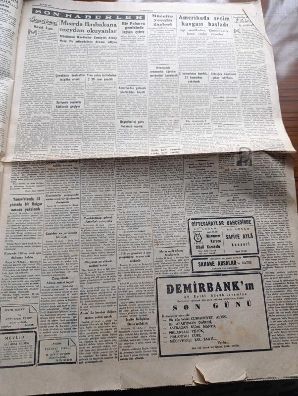 Cumhuriyet Gazetesi - 25 Eylül 1954 - Doğu İllerimizi Karadenize Bağlayan Yeni Kara Yolları - Tıp Kongresi - Cumhurreisi Celal Bayar'ı Aydın'a NATO Komutanı Uğurladı Fotoğraf - Radyo İle Sevkedilen Mermiler - Tren Yolcu Tarifelerine Yüzde 25 Zam Yapıldı - Talebeler Siyasetle Uğraşmalı Mı - Kıbrıs Davası Genel Kurul Gündemine Alındı - 1001 Kuyu Yazan Va Nü Yazı Dizisi - Londra Geceleri Yazan Robert Fabian Yazı Dizisi - Migros Kamyonlarına İki Buzdolabı Konulacak - Müslüman Kardeşler Cemiyeti Albay Nasr İle Mücadeleye Devam Ediyor - İngiliz Fizikçisi John Bernal'a Stalin Mükafatı - İş Ciddileşti Yazan Burhan Felek Köşe Yazısı - Türkiye Yelken Şampiyonası - Sabite Tur Gülerman Beyaz Park'ta - Bugünkü Radyo Programı - Bahçeden Bir Adam Girdi Yazan Perihan Zorlu Yazı Dizisi - Resimli Roman Yeşil Saksı Yazan George Simenon - Mayfer Revüsü Tepebaşı Cumhuriyet Pavyon Ve Lokantasında, Yunus Nadi tarafından kaleme alınmıştır. Cumhuriyet Gazetesi - 25 Eylül 1954 - Doğu İllerimizi Karadenize Bağlayan Yeni Kara Yolları - Tıp Kongresi - Cumhurreisi Celal Bayar'ı Aydın'a NATO Komutanı Uğurladı Fotoğraf - Radyo İle Sevkedilen Mermiler - Tren Yolcu Tarifelerine Yüzde 25 Zam Yapıldı - Talebeler Siyasetle Uğraşmalı Mı - Kıbrıs Davası Genel Kurul Gündemine Alındı - 1001 Kuyu Yazan Va Nü Yazı Dizisi - Londra Geceleri Yazan Robert Fabian Yazı Dizisi - Migros Kamyonlarına İki Buzdolabı Konulacak - Müslüman Kardeşler Cemiyeti Albay Nasr İle Mücadeleye Devam Ediyor - İngiliz Fizikçisi John Bernal'a Stalin Mükafatı - İş Ciddileşti Yazan Burhan Felek Köşe Yazısı - Türkiye Yelken Şampiyonası - Sabite Tur Gülerman Beyaz Park'ta - Bugünkü Radyo Programı - Bahçeden Bir Adam Girdi Yazan Perihan Zorlu Yazı Dizisi - Resimli Roman Yeşil Saksı Yazan George Simenon - Mayfer Revüsü Tepebaşı Cumhuriyet Pavyon Ve Lokantasında adlı eser Türkçe dilindedir.