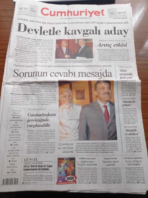 Cumhuriyet Gazetesi - 25 Nisan 2007 - Recep Tayyip Erdoğan Daha Önce Laik Sistemi Hedef Alan ve Eşi Türbanlı Olan Abdullah Gül'ü Köşk'e Çıkarma Kararı Aldı - Çankaya Ve Türban İkilemi - Hayrünnisa Gül - Yaşar Büyükanıt - Kutlu Doğum Karmaşası - Beşiktaş Fenerbahçe Derbisi - Zirve Yayıncılık Katliamı - Güler Sabancı adlı eser Türkçe dilindedir.
