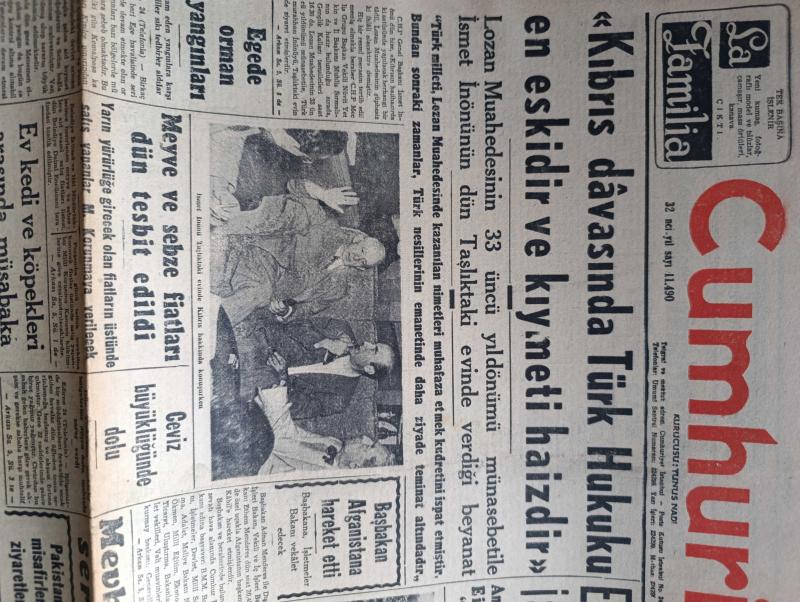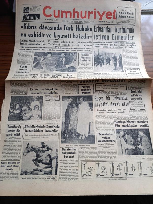 Cumhuriyet Gazetesi - 25 Temmuz 1956 - Kıbrıs Davasında Türk Hukuku En Eskidir Ve Kıymeti Haizdir - Erivandan Kurtulmak İsteyen Ermeniler - İsmet İnönü Taşlıktaki Evinde Kıbrıs Hakkında Konuşurken Fotoğraf - Başbakan Adnan Menderes Afganistana Hareket Etti - Lozan Muahedesinin 33. Yıldönümü - Binicilerimizin Londra'da Kazandıkları Başarılar - Binicilik Ekibi Kaptanı Binbaşı Salih Koç Fotoğraf - Gülhane Parkında Yapılan Ev Kedi ve Köpekleri Arasında Müsabaka - Beynelmilel Yelken Müsabakaları - İki Devrin Perde Arkası Yazan Samih Nafiz Tansu Yazı Dizisi - Karanlıkta Sesler Yazan Perihan Zorlu Yazı Dizisi - Mussolini'nin Çocuklarına Maaş Bağlanıyor -Yeni Araba Vapurları - Borsa - Adalar Güzeli Ve Film Yıldızı Ayten Çankaya Puro Tuvalet Sabunu Kullanıyorum Diyor - Karacaoğlan Yazan Yaşar Kemal Resimleyen Münif Fehim Yazı Dizisi - Resimli Romanımız Kraliçenin Gerdanlığı Yazan Pierre Gordeaux - Tenisçi Nazmi Bari Fotoğraf - Futbol Hakem Mektebi Açılıyor - Novi Belgrad Voleybol Takımı, Yunus Nadi tarafından kaleme alınmıştır. Cumhuriyet Gazetesi - 25 Temmuz 1956 - Kıbrıs Davasında Türk Hukuku En Eskidir Ve Kıymeti Haizdir - Erivandan Kurtulmak İsteyen Ermeniler - İsmet İnönü Taşlıktaki Evinde Kıbrıs Hakkında Konuşurken Fotoğraf - Başbakan Adnan Menderes Afganistana Hareket Etti - Lozan Muahedesinin 33. Yıldönümü - Binicilerimizin Londra'da Kazandıkları Başarılar - Binicilik Ekibi Kaptanı Binbaşı Salih Koç Fotoğraf - Gülhane Parkında Yapılan Ev Kedi ve Köpekleri Arasında Müsabaka - Beynelmilel Yelken Müsabakaları - İki Devrin Perde Arkası Yazan Samih Nafiz Tansu Yazı Dizisi - Karanlıkta Sesler Yazan Perihan Zorlu Yazı Dizisi - Mussolini'nin Çocuklarına Maaş Bağlanıyor -Yeni Araba Vapurları - Borsa - Adalar Güzeli Ve Film Yıldızı Ayten Çankaya Puro Tuvalet Sabunu Kullanıyorum Diyor - Karacaoğlan Yazan Yaşar Kemal Resimleyen Münif Fehim Yazı Dizisi - Resimli Romanımız Kraliçenin Gerdanlığı Yazan Pierre Gordeaux - Tenisçi Nazmi Bari Fotoğraf - Futbol Hakem Mektebi Açılıyor - Novi Belgrad Voleybol Takımı adlı eser Türkçe dilindedir.