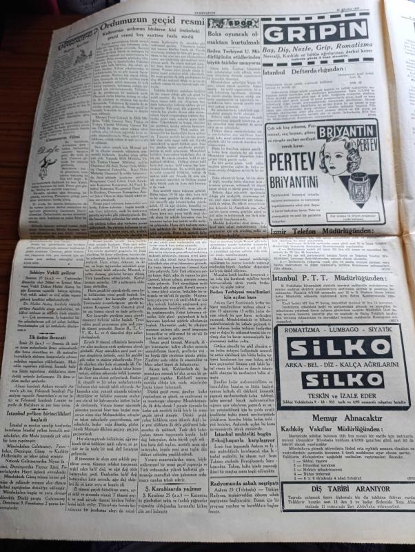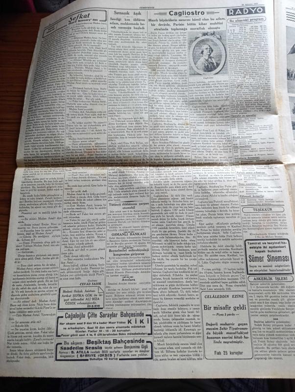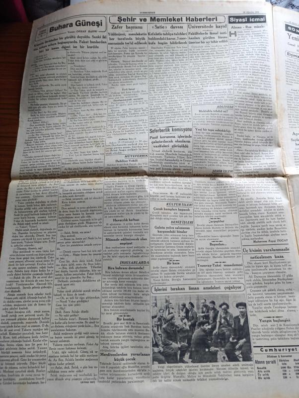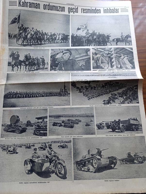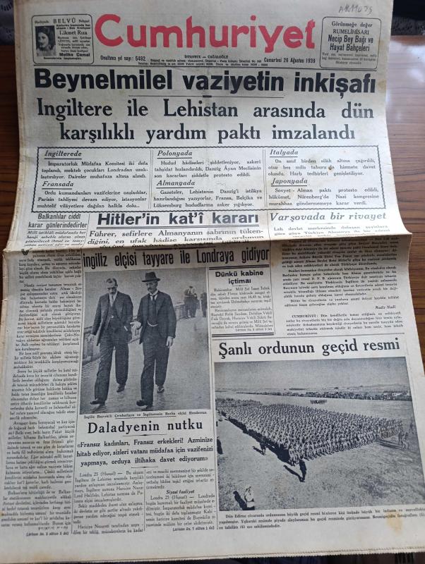 Cumhuriyet Gazetesi - 26 Ağustos 1939 - balkanlılar ciddi karar günlerindedirler Yazan Yunus Nadi Başmakale - Beynelmilel Vaziyetin İnkişafı - İngiltere ile Lehistan arasında Dün karşılıklı yardım Paktı imzalandı - Varşova'da bir rivayet yazan Nadir Nadi - Hitler'in kati kararı - Führer Sefirlere Almanya'nın sabrın tükendiğini söyledi - İngiliz başvekili Çemberlayn Ve İngiltere'nin Berlin elçisi Hendersun fotoğraf - tarihi roman Buhara güneşi yazan Orhan Rahmi - Zafer Bayramı yıldönümü sebebiyle memleketin her yerinde törenler düzenlenecek - bira buhranı devam ediyor - Kadeş vapuru geldi - İş Bankasının 15. Yıldönümü - Kahraman ordumuzun geçit resminden fotoğraflar - Büyük Mareşal Fevzi Çakmak'ın Kahraman orduya selamı fotoğraf - Korgeneral Salih Omurtak geçit resminde fotoğraf - bu akşamki radyo programı - İstanbul karması bugün Beyoğlusporla karşılaşıyor - boks oyuncak olmaktan kurtulmalı - Moskova'daki Alman heyeti şerefine ziyafet - Menşure Tunay Beyaz Parkta - Laksan Revüsü İncide adlı eser, Kitap > Süreli Yayınlar > Gazeteler > Türkiye > Genel > Haftalık kategorisinde İkinci El olarak satıştadır.
