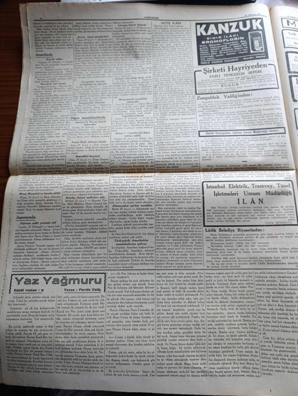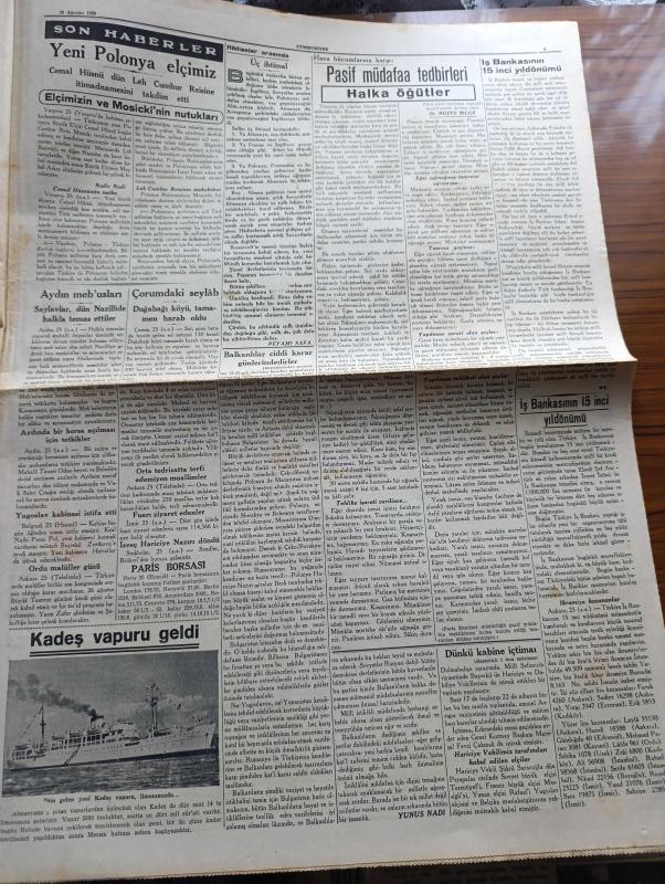 Cumhuriyet Gazetesi - 26 Ağustos 1939 - balkanlılar ciddi karar günlerindedirler Yazan Yunus Nadi Başmakale - Beynelmilel Vaziyetin İnkişafı - İngiltere ile Lehistan arasında Dün karşılıklı yardım Paktı imzalandı - Varşova'da bir rivayet yazan Nadir Nadi - Hitler'in kati kararı - Führer Sefirlere Almanya'nın sabrın tükendiğini söyledi - İngiliz başvekili Çemberlayn Ve İngiltere'nin Berlin elçisi Hendersun fotoğraf - tarihi roman Buhara güneşi yazan Orhan Rahmi - Zafer Bayramı yıldönümü sebebiyle memleketin her yerinde törenler düzenlenecek - bira buhranı devam ediyor - Kadeş vapuru geldi - İş Bankasının 15. Yıldönümü - Kahraman ordumuzun geçit resminden fotoğraflar - Büyük Mareşal Fevzi Çakmak'ın Kahraman orduya selamı fotoğraf - Korgeneral Salih Omurtak geçit resminde fotoğraf - bu akşamki radyo programı - İstanbul karması bugün Beyoğlusporla karşılaşıyor - boks oyuncak olmaktan kurtulmalı - Moskova'daki Alman heyeti şerefine ziyafet - Menşure Tunay Beyaz Parkta - Laksan Revüsü İncide, Yunus Nadi tarafından kaleme alınmıştır. Cumhuriyet Gazetesi - 26 Ağustos 1939 - balkanlılar ciddi karar günlerindedirler Yazan Yunus Nadi Başmakale - Beynelmilel Vaziyetin İnkişafı - İngiltere ile Lehistan arasında Dün karşılıklı yardım Paktı imzalandı - Varşova'da bir rivayet yazan Nadir Nadi - Hitler'in kati kararı - Führer Sefirlere Almanya'nın sabrın tükendiğini söyledi - İngiliz başvekili Çemberlayn Ve İngiltere'nin Berlin elçisi Hendersun fotoğraf - tarihi roman Buhara güneşi yazan Orhan Rahmi - Zafer Bayramı yıldönümü sebebiyle memleketin her yerinde törenler düzenlenecek - bira buhranı devam ediyor - Kadeş vapuru geldi - İş Bankasının 15. Yıldönümü - Kahraman ordumuzun geçit resminden fotoğraflar - Büyük Mareşal Fevzi Çakmak'ın Kahraman orduya selamı fotoğraf - Korgeneral Salih Omurtak geçit resminde fotoğraf - bu akşamki radyo programı - İstanbul karması bugün Beyoğlusporla karşılaşıyor - boks oyuncak olmaktan kurtulmalı - Moskova'daki Alman heyeti şerefine ziyafet - Menşure Tunay Beyaz Parkta - Laksan Revüsü İncide adlı eser Türkçe dilindedir.