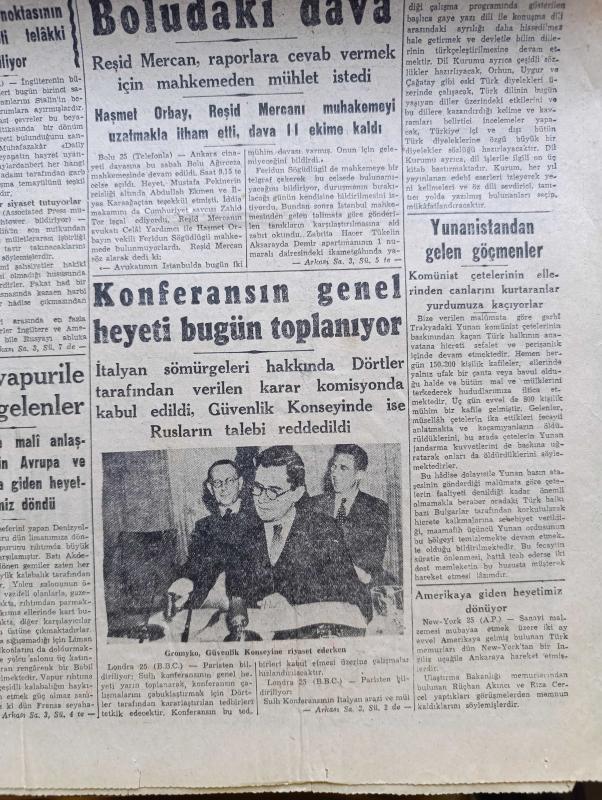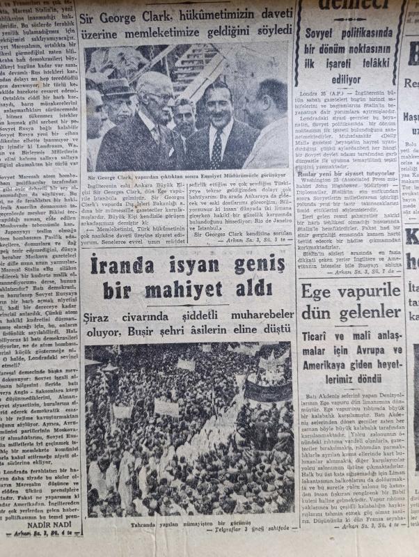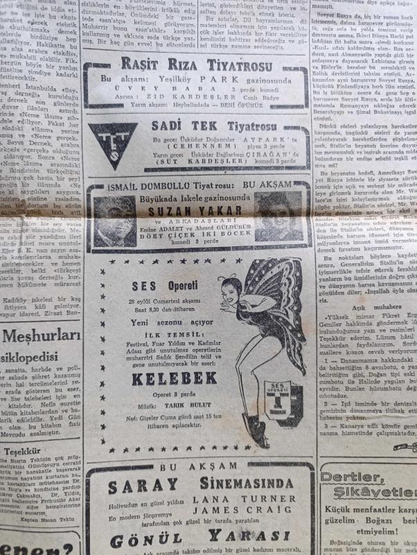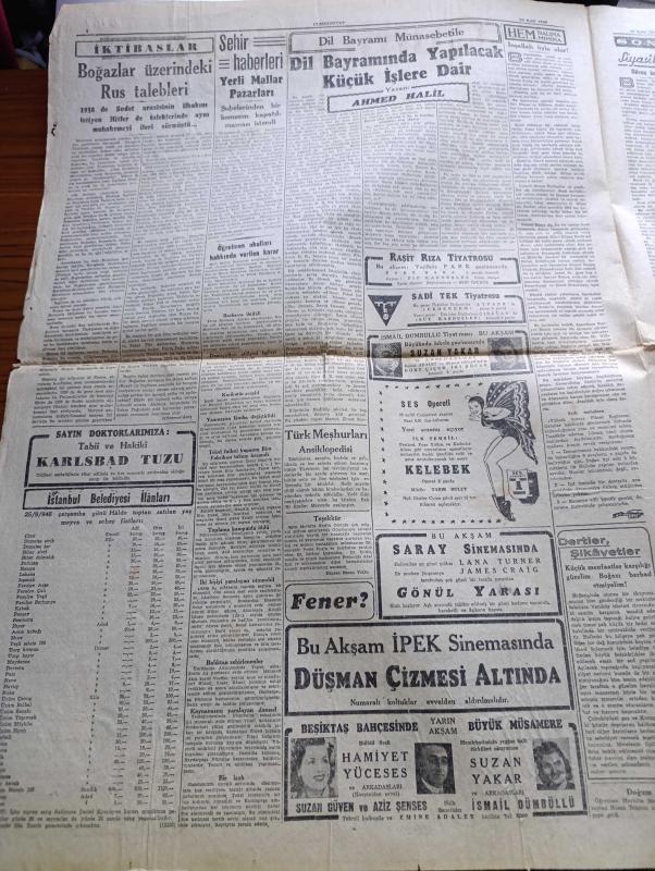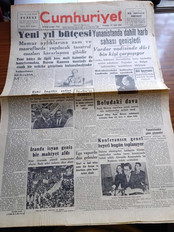 Cumhuriyet Gazetesi - 26 Eylül 1946 - Anlaşılmaz Bir Ferahlık Yazan Nadir Nadi Köşe Yazısı - Yeni Yıl Bütçesi - Maliye Bakanı Halid Nazmi Keşmir Makamında Fotoğraf- Stalin'in Demeci - Eski İngiliz Demeci Sir George Clark Dün İstanbul'a Geldi - Yunanistan'da Dahili Harp Sahası Genişledi - Vardar Vadisinde Dört Bin Kişi Çarpışıyor - Dil Bayramı Bugün Bütün Halkevlerinde Törenle Yapılacak - İran'da İsyan Geniş Bir Mahiyet Aldı - Boğazlar Üzerinde Rus Talepleri - Yerli Mallar Pazarları - Dil Bayramında Yapılacak Küçük İşlere Dair Yazan Ahmed Halil - Raşid Rıza Tiyatrosu Üvey Baba Yeşilköy Park Gazinosunda - Yemek Futbol Kupasını Bira Fabrikası Kazandı - Hamiyet Yüceses ve Suzan Yakar Beşiktaş Bahçesinde - Yavuz Sultan Selim Ağlıyor Yazan Feridun Fazıl Tülbentçi Yazı Dizisi - Siyasi İcmal Güven Buhranı Yazan Ömer Rıza Doğrul Köşe Yazısı - Sinir Harbi Karşısında Türkiye ve Yunanistan - Müşaare Renkli Karikatür Çizen Cemal Nadir - Bugünkü Radyo Programı - Borsa - Şehir Tiyatroları Programı adlı eser, Kitap > Süreli Yayınlar > Gazeteler > Türkiye > Genel > Günlük kategorisinde İkinci El olarak satıştadır.