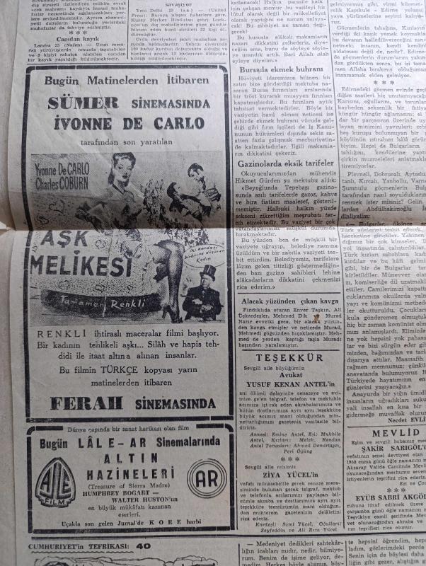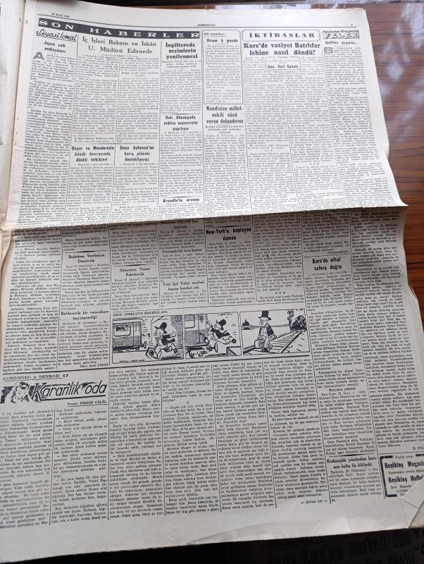 Cumhuriyet Gazetesi - 26 Eylül 1950 - Köşe Kapmaca Yazan Nadir Nadi Köşe Yazısı - Celal Bayar Ve Adnan Menderes'in Kömür Havzasında Dünkü Tetkikleri - İçişleri Bakanı Rükneddin Nasuhioğlu Ve İskan Müdürü Yekta Aytan Edirne'de - Edirne'ye Gelen Göçmenler Ve Acıklı Bir Levha Kırık Bebek Fotoğraf - Dean Achesonun Barış Planını Destekliyoruz - Göçmenleri İyi Karşılıyamıyoruz - Giritte Zelzele - Kore'de Nihai Zafere Doğru - Atlantiği Geçen İlk Tepkili Uçak Fotoğraf - Komintern'in İçyüzü Yazan Castro Delgado Yazı Dizisi - 9. Milletlerarası Tarih Kongresi Yazan Hasan Ali Yücel - Otel Lokanta Ve Gazinocular Sendikası Kuruluyor - Karanlık Oda Yazan Peride Celal Yazı Dizisi - İvonne De Carlo Tarafından Yaratılan Aşk Melikesi Sümer Sinemasında - Hep O Masal Yazan Kemal Ragıp Enson Yazı Dizisi - Galatasaray Takımı Dün Londra'dan Döndü - Hamiyet Yüceses Ahmet Üstün Bu Gece Suadiye Plaj Gazinosunda - Siemens Alman Radyoları - Dentol Diş Macunu - Volvo Kamyonları - Puro Tuvalet Sabunu, Yunus Nadi tarafından kaleme alınmıştır. Cumhuriyet Gazetesi - 26 Eylül 1950 - Köşe Kapmaca Yazan Nadir Nadi Köşe Yazısı - Celal Bayar Ve Adnan Menderes'in Kömür Havzasında Dünkü Tetkikleri - İçişleri Bakanı Rükneddin Nasuhioğlu Ve İskan Müdürü Yekta Aytan Edirne'de - Edirne'ye Gelen Göçmenler Ve Acıklı Bir Levha Kırık Bebek Fotoğraf - Dean Achesonun Barış Planını Destekliyoruz - Göçmenleri İyi Karşılıyamıyoruz - Giritte Zelzele - Kore'de Nihai Zafere Doğru - Atlantiği Geçen İlk Tepkili Uçak Fotoğraf - Komintern'in İçyüzü Yazan Castro Delgado Yazı Dizisi - 9. Milletlerarası Tarih Kongresi Yazan Hasan Ali Yücel - Otel Lokanta Ve Gazinocular Sendikası Kuruluyor - Karanlık Oda Yazan Peride Celal Yazı Dizisi - İvonne De Carlo Tarafından Yaratılan Aşk Melikesi Sümer Sinemasında - Hep O Masal Yazan Kemal Ragıp Enson Yazı Dizisi - Galatasaray Takımı Dün Londra'dan Döndü - Hamiyet Yüceses Ahmet Üstün Bu Gece Suadiye Plaj Gazinosunda - Siemens Alman Radyoları - Dentol Diş Macunu - Volvo Kamyonları - Puro Tuvalet Sabunu adlı eser Türkçe dilindedir.