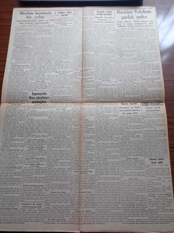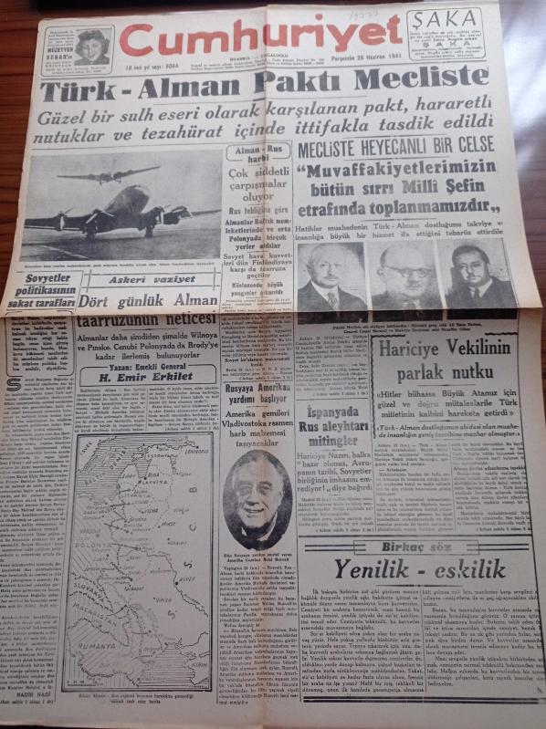 Cumhuriyet Gazetesi - 26 Haziran 1941 - Tıpkıbasım - Müzeyyen Senar'ın Tatlı Sesini Taksim Kristal'de Zevkle Dinleyebilirsiniz - Türk Alman Paktı Mecliste - Dün Rusya'ya Yardım Emrini Veren Amerikalı Cumhur Reisi Roosevelt - Hitler Bilhassa Büyük Atamız İçin Güzel Ve Doğru Mütalealarile Türk Milletinin Kalbini Harekete Getirdi - Dört Günlük Alman Taarruzunun Neticesi - Mecliste Heyecanlı Bir Celse- Ali Rana Tarhan adlı eser, Kitap > Süreli Yayınlar > Gazeteler kategorisinde İkinci El olarak satıştadır.