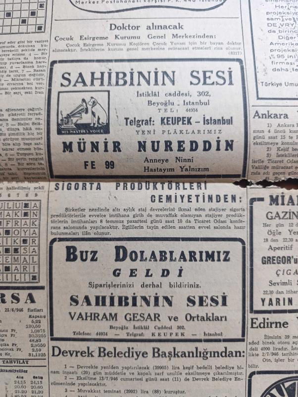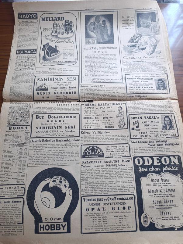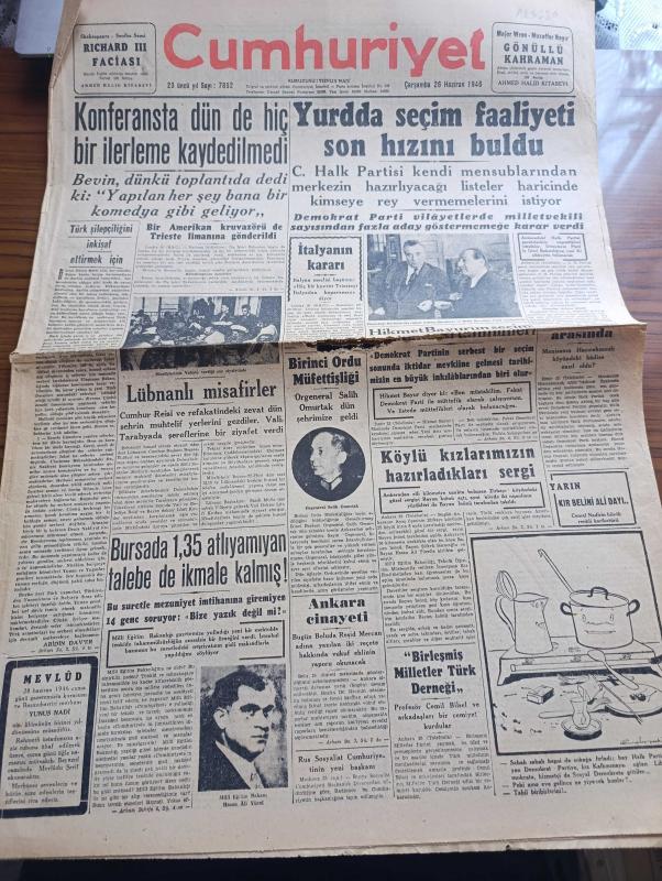 Cumhuriyet Gazetesi - 26 Haziran 1946 - Türk Şilepçiliğini İnkişaf Ettirmek İçin Yazan Abidin Daver Başmakale - Konferansta Dün De Hiç İlerleme Kaydedilmedi - Lübnan Cumhurbaşkanı Beşare Elhuri Valinin Verdiği Çay Ziyafetinde Fotoğraf - Yurtta Seçim Faaliyeti Son Hızını Buldu - Demokrat Partili Refik Koraltan Ve Adnan Menderes Parti Merkezinde Fotoğrafı - Hikmet Bayur'un Seçim Hakkındaki Tahminleri - Profesör Cemil Bilsel Ve Arkadaşları Bir Cemiyet Kurdular - Birleşmiş Milletler Türk Derneği - Milli Eğitim Bakanı Hasan Ali Yücel - Bursa'da 1,35 Atlayamayan Talebe De İkmale Kalmış - Sanat Dünyasında Harp Sonrası Yazan Muhsin Ertuğrul - Sonsuz Panayır Yazan Halide Edip Adıvar Yazı Dizisi - Amcabey Ve Hürriyet Çizen Cemal Nadir - Ekmek Meselesi Yazan Burhan Felek Köşe Yazısı - Küçük Hikaye Acele Nikah Yazan Fasih Işın - Galatasaray Ve Beşiktaş Taraftarından Davet Edilen Fransız Takımı Angulem Geldi - Münir Nurettin Yeni Plakları Sahibinin Sesi - Suzan Yakar Columbia Plaklarında, Yunus Nadi tarafından kaleme alınmıştır. Cumhuriyet Gazetesi - 26 Haziran 1946 - Türk Şilepçiliğini İnkişaf Ettirmek İçin Yazan Abidin Daver Başmakale - Konferansta Dün De Hiç İlerleme Kaydedilmedi - Lübnan Cumhurbaşkanı Beşare Elhuri Valinin Verdiği Çay Ziyafetinde Fotoğraf - Yurtta Seçim Faaliyeti Son Hızını Buldu - Demokrat Partili Refik Koraltan Ve Adnan Menderes Parti Merkezinde Fotoğrafı - Hikmet Bayur'un Seçim Hakkındaki Tahminleri - Profesör Cemil Bilsel Ve Arkadaşları Bir Cemiyet Kurdular - Birleşmiş Milletler Türk Derneği - Milli Eğitim Bakanı Hasan Ali Yücel - Bursa'da 1,35 Atlayamayan Talebe De İkmale Kalmış - Sanat Dünyasında Harp Sonrası Yazan Muhsin Ertuğrul - Sonsuz Panayır Yazan Halide Edip Adıvar Yazı Dizisi - Amcabey Ve Hürriyet Çizen Cemal Nadir - Ekmek Meselesi Yazan Burhan Felek Köşe Yazısı - Küçük Hikaye Acele Nikah Yazan Fasih Işın - Galatasaray Ve Beşiktaş Taraftarından Davet Edilen Fransız Takımı Angulem Geldi - Münir Nurettin Yeni Plakları Sahibinin Sesi - Suzan Yakar Columbia Plaklarında adlı eser Türkçe dilindedir.