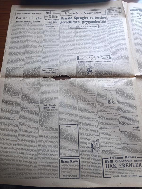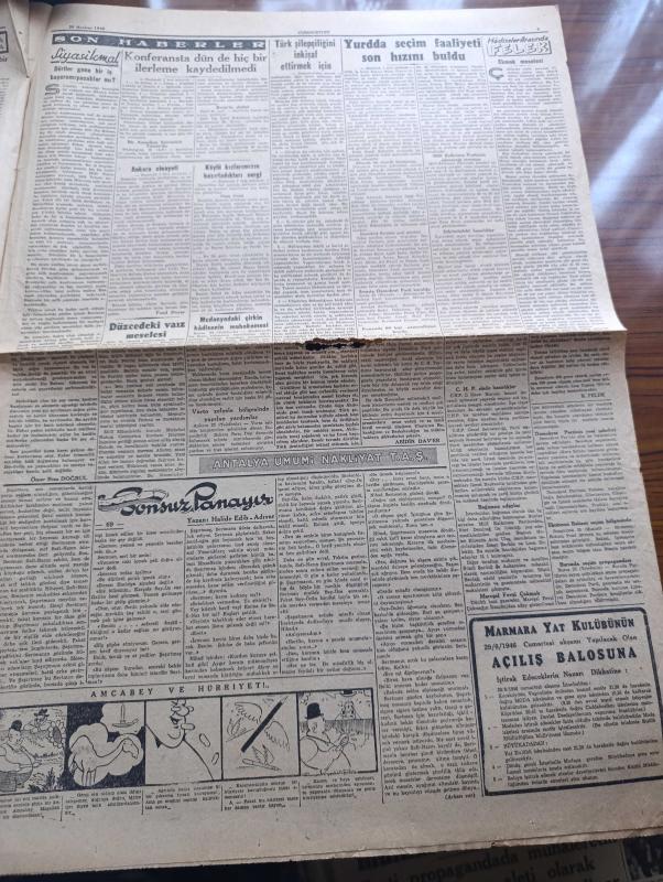 Cumhuriyet Gazetesi - 26 Haziran 1946 - Türk Şilepçiliğini İnkişaf Ettirmek İçin Yazan Abidin Daver Başmakale - Konferansta Dün De Hiç İlerleme Kaydedilmedi - Lübnan Cumhurbaşkanı Beşare Elhuri Valinin Verdiği Çay Ziyafetinde Fotoğraf - Yurtta Seçim Faaliyeti Son Hızını Buldu - Demokrat Partili Refik Koraltan Ve Adnan Menderes Parti Merkezinde Fotoğrafı - Hikmet Bayur'un Seçim Hakkındaki Tahminleri - Profesör Cemil Bilsel Ve Arkadaşları Bir Cemiyet Kurdular - Birleşmiş Milletler Türk Derneği - Milli Eğitim Bakanı Hasan Ali Yücel - Bursa'da 1,35 Atlayamayan Talebe De İkmale Kalmış - Sanat Dünyasında Harp Sonrası Yazan Muhsin Ertuğrul - Sonsuz Panayır Yazan Halide Edip Adıvar Yazı Dizisi - Amcabey Ve Hürriyet Çizen Cemal Nadir - Ekmek Meselesi Yazan Burhan Felek Köşe Yazısı - Küçük Hikaye Acele Nikah Yazan Fasih Işın - Galatasaray Ve Beşiktaş Taraftarından Davet Edilen Fransız Takımı Angulem Geldi - Münir Nurettin Yeni Plakları Sahibinin Sesi - Suzan Yakar Columbia Plaklarında adlı eser, Kitap > Süreli Yayınlar > Gazeteler > Türkiye > Genel > Günlük kategorisinde İkinci El olarak satıştadır.