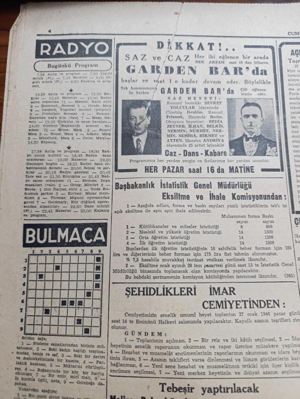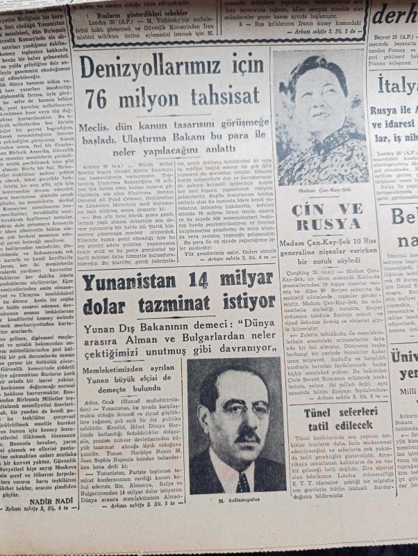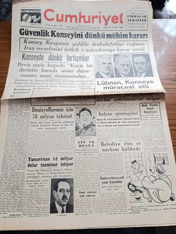 Cumhuriyet Gazetesi - 26 Ocak 1946 - Komisyon Kurunuz Yazan Nadir Nadi Başmakale - Güvenlik Konseyinin Dünkü Mühim Kararı - Konsey Rusya'nın Şiddetle Muhalefetine Rağmen İran Meselesini Tetkik Ve Müzakereye Karar Verdi - Konseyde Dünkü Tartışmalar - Bevin Şöyle Bağırdı Küçük Bir Devletin Sesini Duyurmasına Mani Olmamak Lazım - Lübnan Konseye Müracaat Etti - Lübnan Fransız Ve İngiliz Kuvvetlerinin Topraklarından Çekilmesini İstiyor - Madam Çan Kay Şek 10 Rus Generaline Nişanlar Verirken Bir Nutuk Söyledi - İtalyan Sömürgeleri - Belediye Dün Et Narkını Söyledi - Yunanistan 14 Milyar Dolar Tazminat İstiyor - Amerikalı Gözüyle Bugünkü Türkiye Yazan Summer Welles - Şehir Tiyatrosunda Küçük Şehir Sahneye Koyan Muhsin Ertuğrul - Sirkeci Konya Lezzet Lokantası - Miskinler Tekkesi Yazan Reşat Nuri Güntekin Yazı Dizisi - Kızıl Saçlı Kadın Bugün Elhamra Sinemasında - Cemal Tollu Sergisi Ve Bursa - Şevket Yolcular Bedia Zeynep Garden Barda - Bugünkü Radyo Programı - Bulmaca - Borsa, Yunus Nadi tarafından kaleme alınmıştır. Cumhuriyet Gazetesi - 26 Ocak 1946 - Komisyon Kurunuz Yazan Nadir Nadi Başmakale - Güvenlik Konseyinin Dünkü Mühim Kararı - Konsey Rusya'nın Şiddetle Muhalefetine Rağmen İran Meselesini Tetkik Ve Müzakereye Karar Verdi - Konseyde Dünkü Tartışmalar - Bevin Şöyle Bağırdı Küçük Bir Devletin Sesini Duyurmasına Mani Olmamak Lazım - Lübnan Konseye Müracaat Etti - Lübnan Fransız Ve İngiliz Kuvvetlerinin Topraklarından Çekilmesini İstiyor - Madam Çan Kay Şek 10 Rus Generaline Nişanlar Verirken Bir Nutuk Söyledi - İtalyan Sömürgeleri - Belediye Dün Et Narkını Söyledi - Yunanistan 14 Milyar Dolar Tazminat İstiyor - Amerikalı Gözüyle Bugünkü Türkiye Yazan Summer Welles - Şehir Tiyatrosunda Küçük Şehir Sahneye Koyan Muhsin Ertuğrul - Sirkeci Konya Lezzet Lokantası - Miskinler Tekkesi Yazan Reşat Nuri Güntekin Yazı Dizisi - Kızıl Saçlı Kadın Bugün Elhamra Sinemasında - Cemal Tollu Sergisi Ve Bursa - Şevket Yolcular Bedia Zeynep Garden Barda - Bugünkü Radyo Programı - Bulmaca - Borsa adlı eser Türkçe dilindedir.