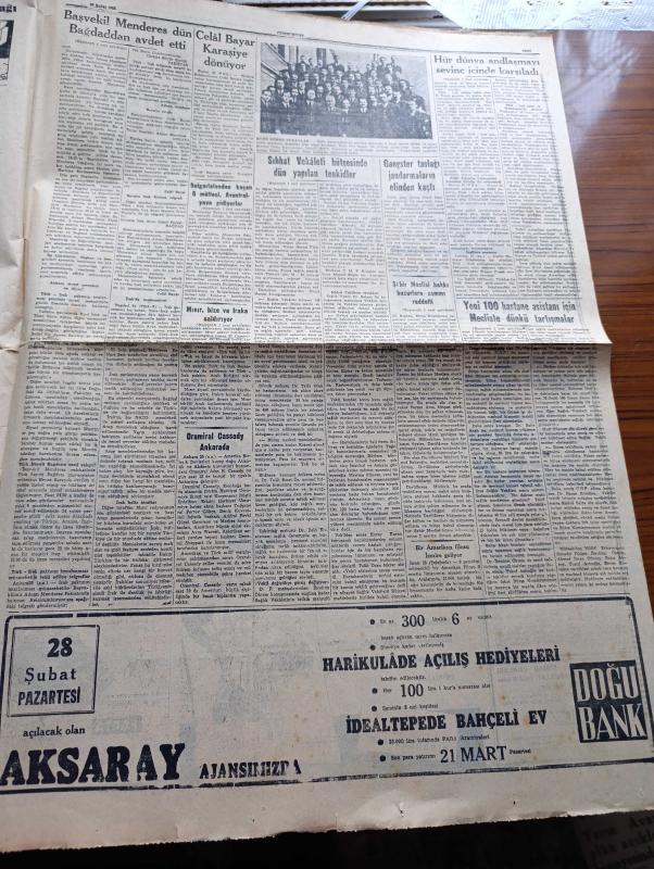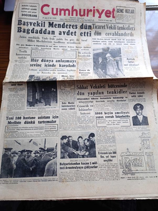 Cumhuriyet Gazetesi - 26 Şubat 1955 - Başvekil Adnan Menderes Dün Bağdat'tan Geri Döndü - Başvekil Adnan Menderes Bağdat Havaalanında Nuri Said Paşa İle Birlikte Fotoğraf - 2,5 ve 5 Liralıklar Metal Oluyor - Fransa Ordu Takımı İle Maç Yapacağız - Yeni 100 Hastane Asistanı İçin Mecliste Dünkü Tartışmalar - Fantezi Kravatlı Sahte Şubat Mehmet Kuloğlu - 8000 Beyin Ameliyatı Yapan Cerrah Herbert Oliver İstanbul'da - Sisli Ufuklar Yazan Taylor Caldwell Yazı Dizisi - Önümüzdeki 5 Yıl Harp Olmayacak - Hacıbeyzade Yazan Burhan Felek Köşe Yazısı - Fenerbahçe Hacettepeyi 6 3 Yendi - İstanbul Venedik Kılıç Müsabakaları - Bir Bekarın Sevgilileri Yazan Maurice Dekobra Yazı Dizisi - İstanbul Belediyesi Şehir Tiyatroları Dram Kısmında Altıncı Kat Oyunu - Günün Resimleri - Resimli Roman Gangsterler Yatağı Yazan George Simenon - Günün Resimleri - Shell - Gözen Kremleri - Facta Hesap Makinesi adlı eser, Kitap > Süreli Yayınlar > Gazeteler > Türkiye > Genel > Günlük kategorisinde İkinci El olarak satıştadır.